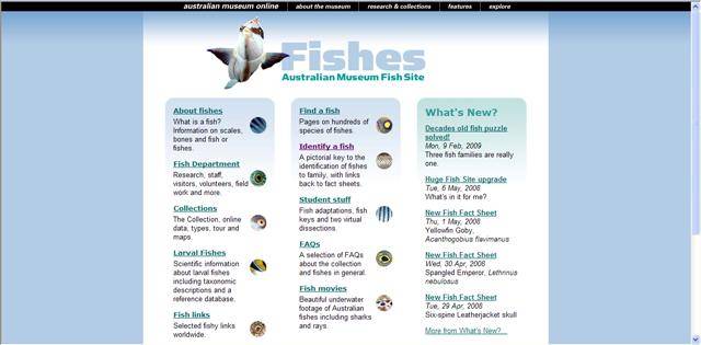 The Australian Museum's fish site is a large database of all things fish. The website holds a host of information on Australian fish research, explanations of the make-up of fish, school assignment research and links to other fish bodies and research worldwide.