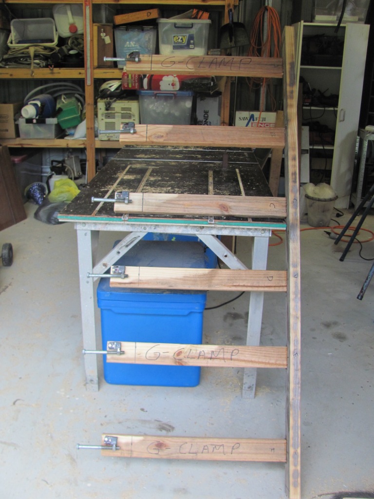 As these planks had to be glued together and clamped, I went to the hardware store and nearly died when I saw the cost of clamps. I ended up making the glueing jig pictured by welding some nuts to box section and screwing these to some battens.