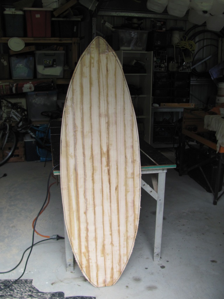 In the end the board is roughly 1600mm long and just under 500mm at its widest. The board has 75mm of nose rocker and 5mm of tail rocker. The bottom concave runs from the nose to the tail and is about 7mm at the deepest point in the middle. The board is close to 22mm at the thickest part.