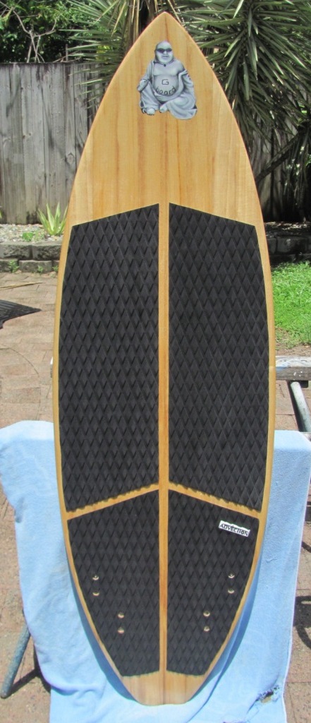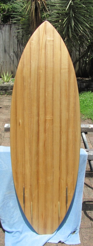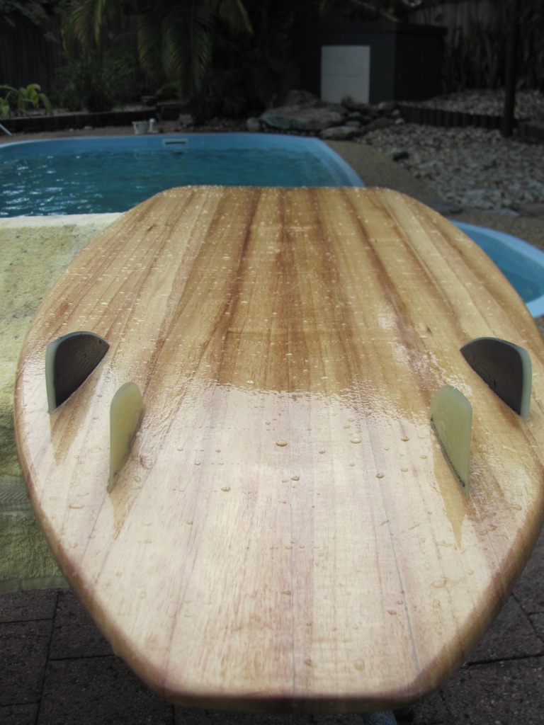 So far I have spent just under $1000, this incudes buying a scroll saw, power planer, random orbital sander, heaps of sandpaper, enough epoxy resin to build a ship, polyurethane clear, stainless crews, carton of beer for the buddha, fins and deck grip. I still have enough wood left to make the core of 2 twin tips but I would have to put some glass over these for strength.