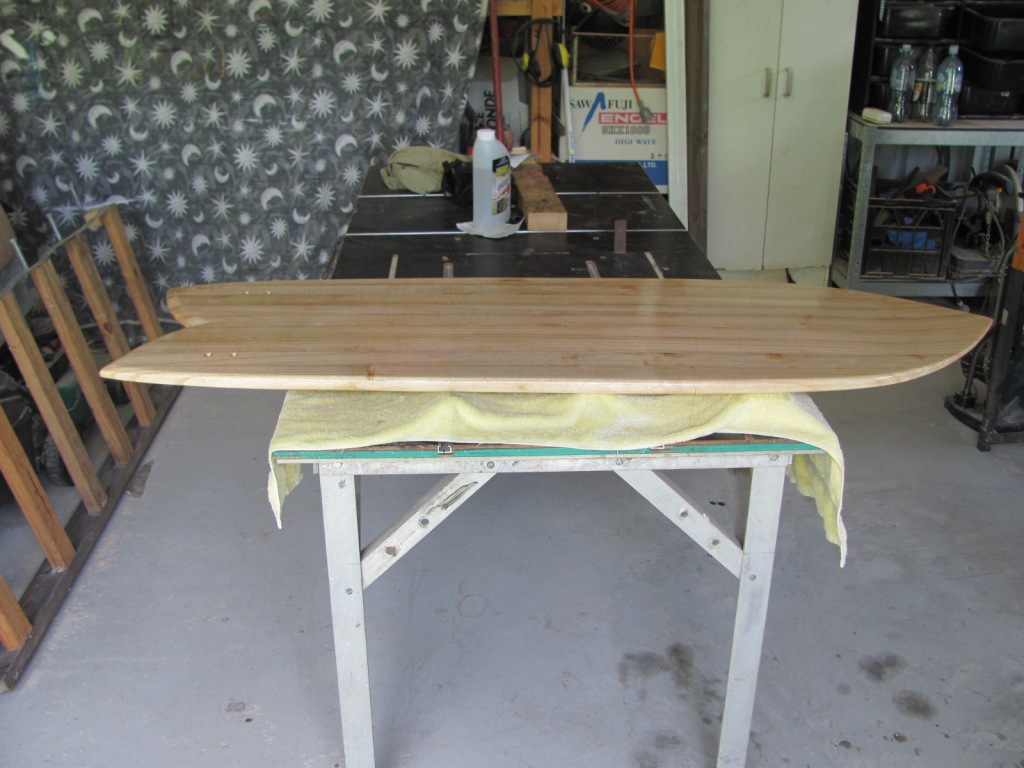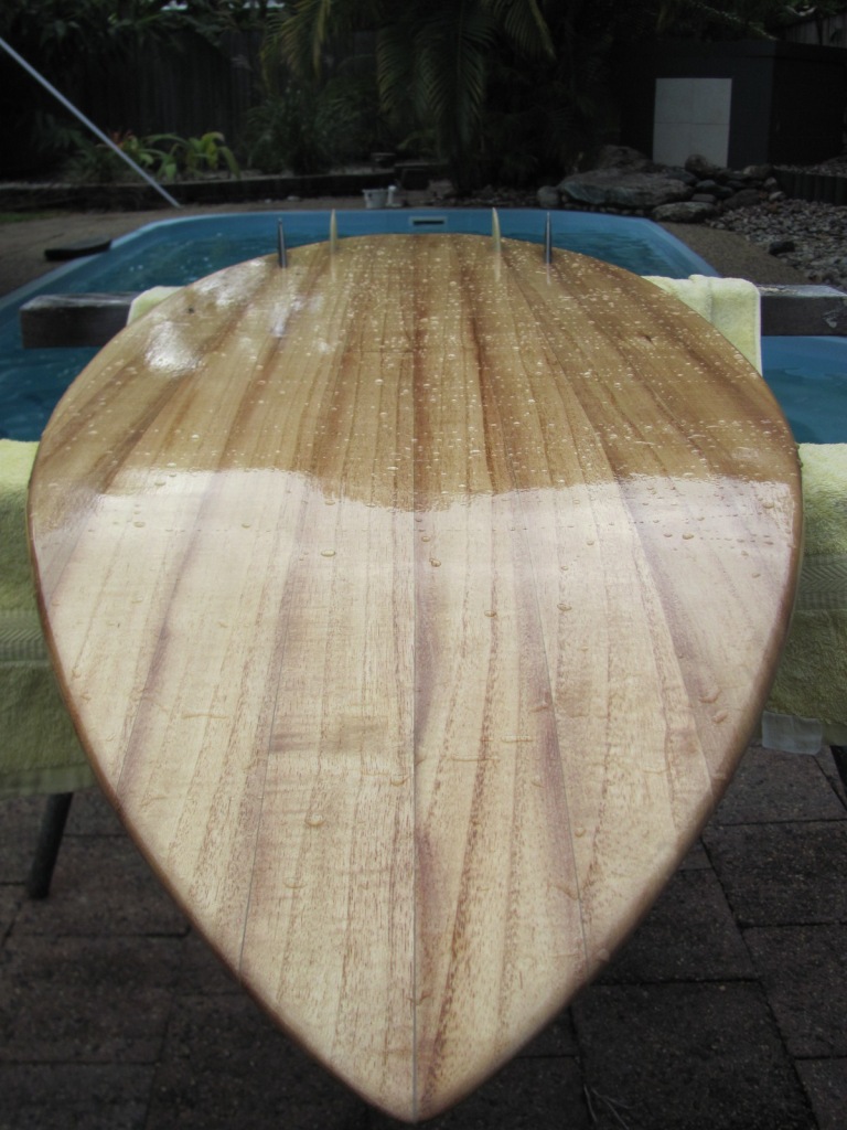 I have not stuck grip or tested this board as yet because we have had no wind and the top coat is still tacky. For this board I decided on a brushed polyester resin finish, still not happy with the end result. The next board will go to a professional to give it that glass look that I would like.