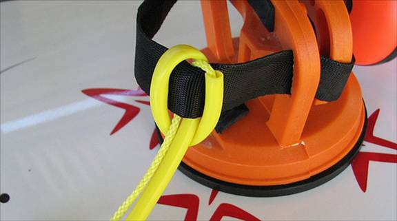 Lock the suction cup in place by raising the lever handle. Make sure it goes on the inside of the tie-down strap.
