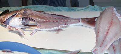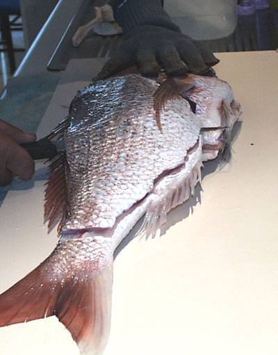 After initially scaling, gilling and gutting the fish at the ramp it is best to fillet the fish at home. The first cut is made behind the pectoral fin and up towards the head. This cut removes the fin and also most of the bones from the rib cage. |