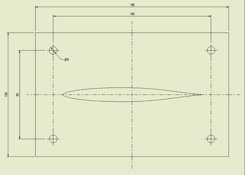 - You now need to add the baseplate onto the mast that will mount to the board. Cut out of 9mm ply a shape like this (including the airfoil shaped hole the mast will slip through). Don’t drill the 4 holes in now – they only come later after lamination.