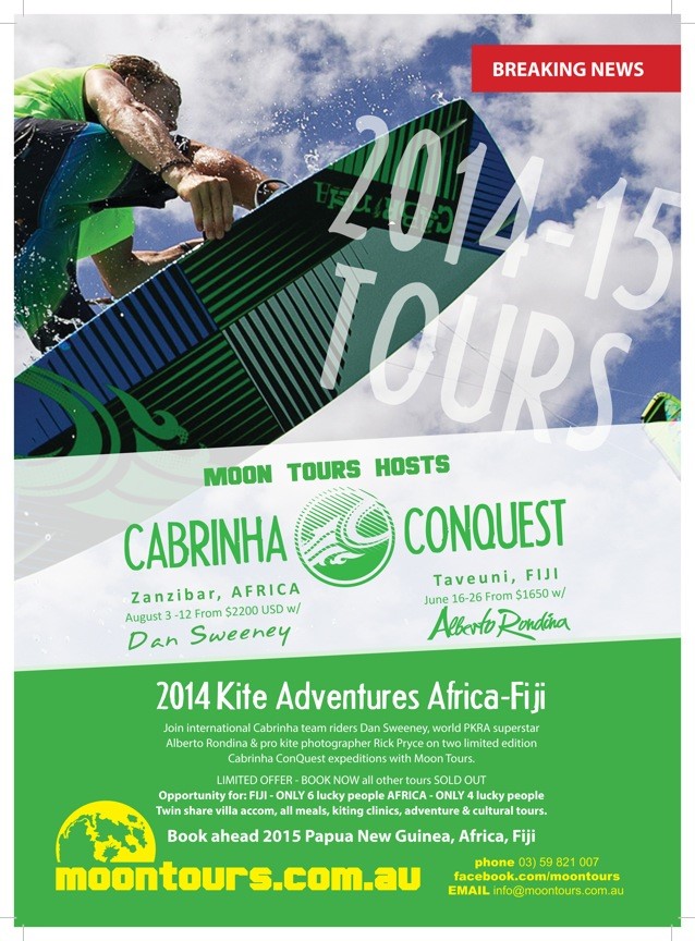Join international Cabrinha team riders Dan Sweeny & Alberton Rondina, along with pro kite photographer Rick Pryce on two limited edition Carinha ConQuest expeditions with Moon Tours.