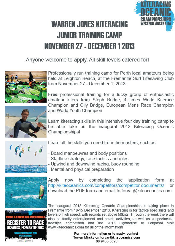 The 2013 Kiteracing Oceanic Championships are proud to announce the Kiteracing Junior Training Camp presented by the Warren Jones Foundation, to give a group of talented amateur water sports people access to training by World Champions Steph and Olly Bridge.