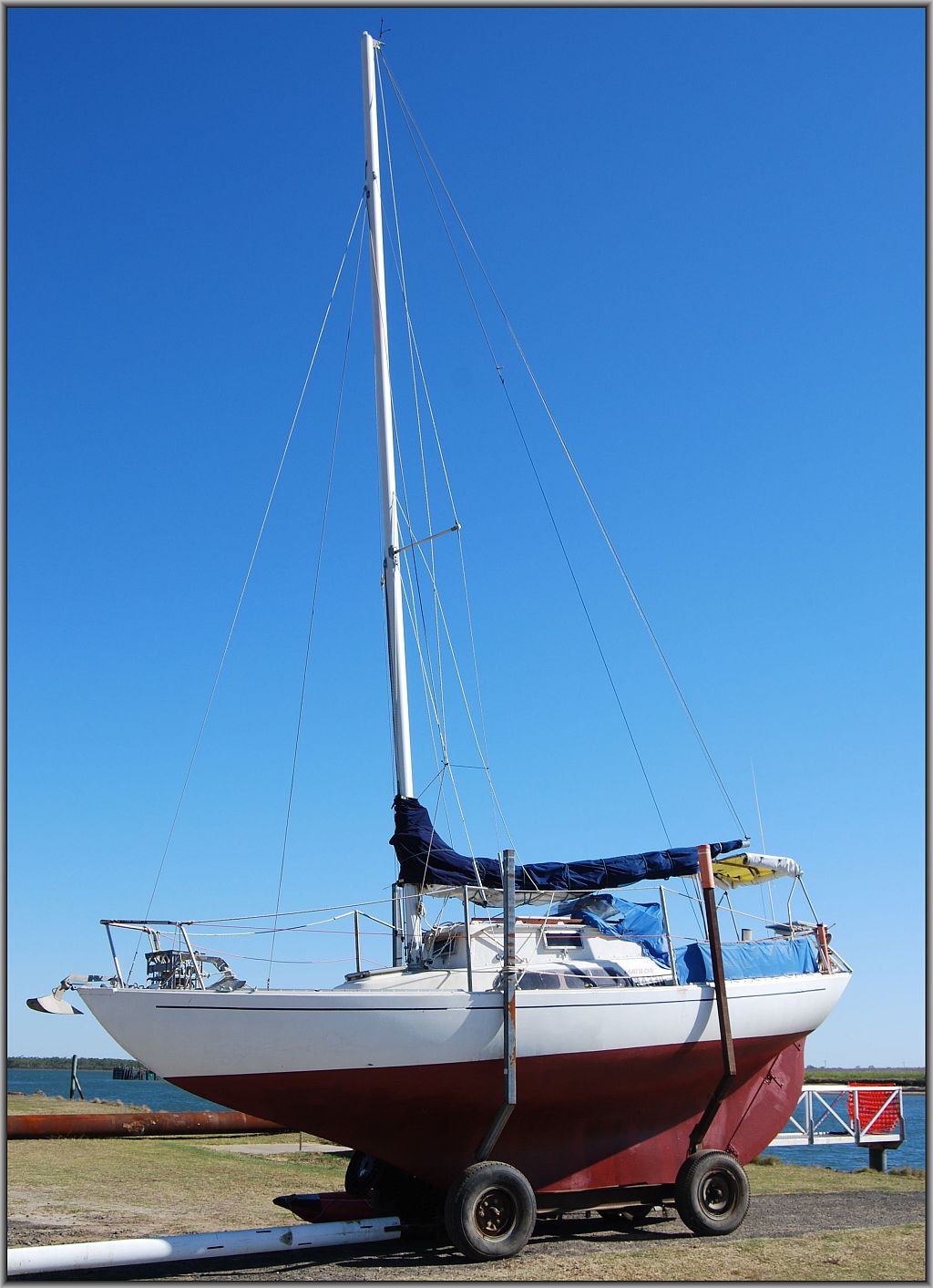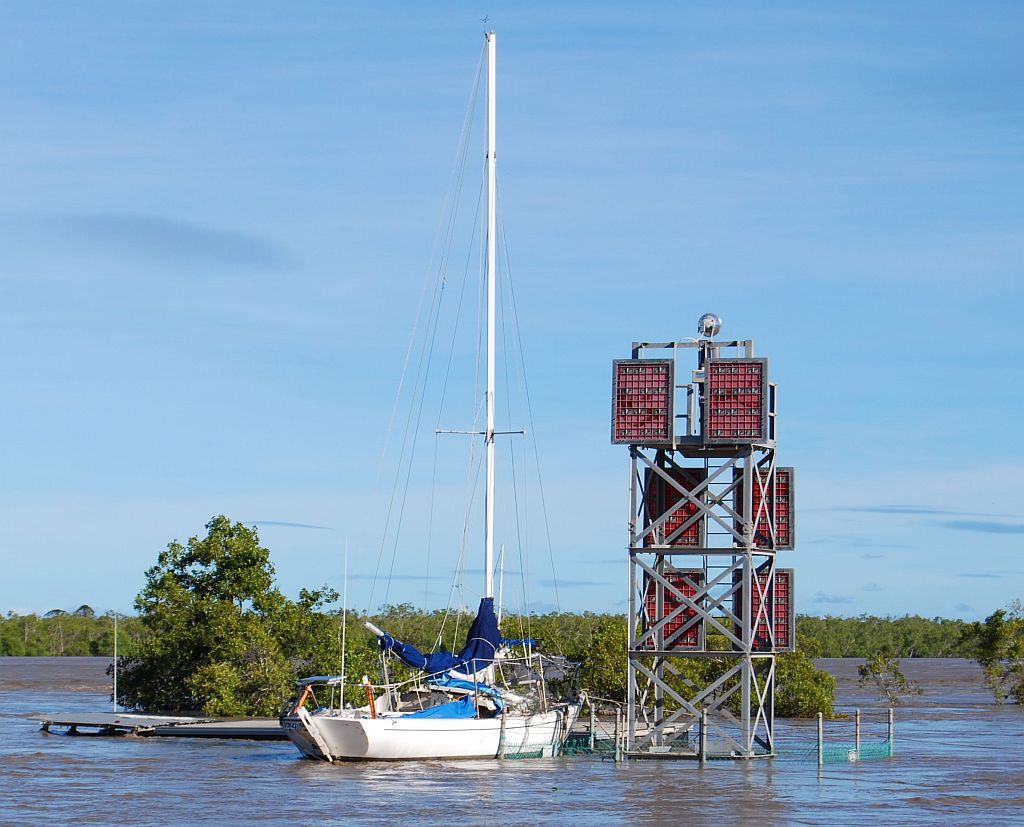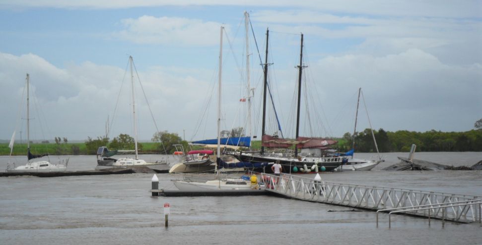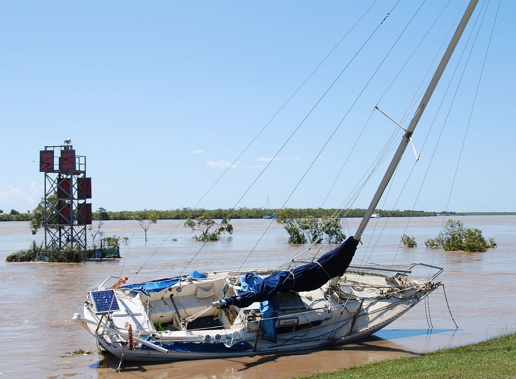 After being damaged in the January flood and after spending almost seven months on a trailer at the Bundaberg Sailing Club undergoing repairs ''Matilda'' sits at the top of the boat ramp waiting for the