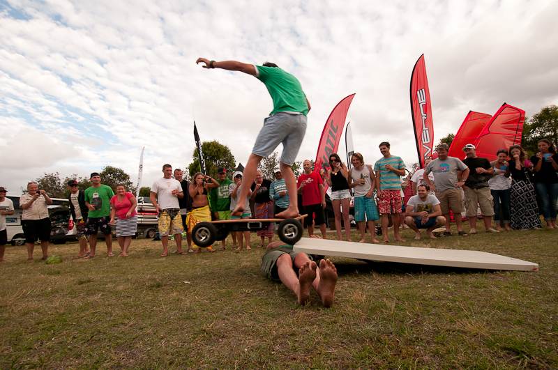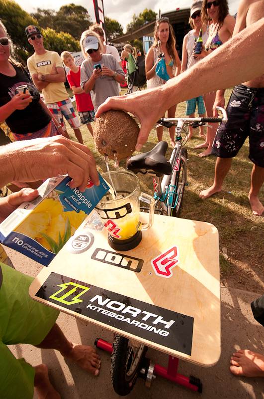 That's not for everyone though, some would prefer a 6 foot barreling freight train to show off their Stand up paddling skills. For these people, just behind the beach at Ford Oval there's always some action going on. Whether it's the barbecue (manned 12 hours a day by the Merimbula Sailboard club) or some kind of bike powered blender - you'll hear fits of laughter erupting from one camp or another, usually it's got something to do with JB and his cronies from Fanatic (Formerly WindGenuity and co.) and this year was no exception.