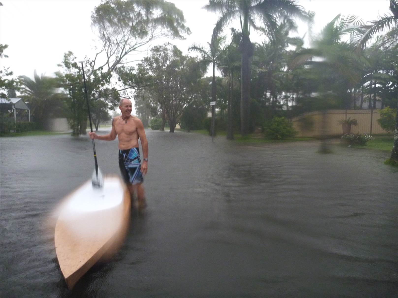 We're talking real street SUP, as in stand up paddling in the middle of your street, on the floaty kind of board. Not a skateboard. John Townsend lives in Buddina on the Sunshine coast and this week, over 100mm of rain fell in under an hour. The result? His very own training channel outside his house. Unfortunately he would have gathered participate in the Kawana Time trial series down the road, but as one forum member said - it's not every day that you can SUP in your very own street.