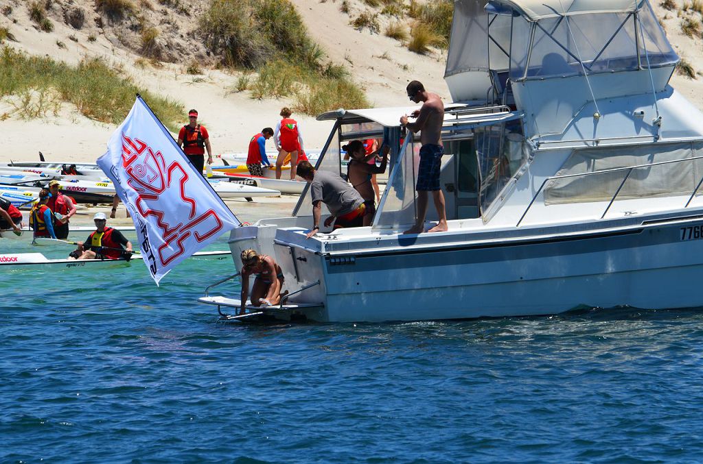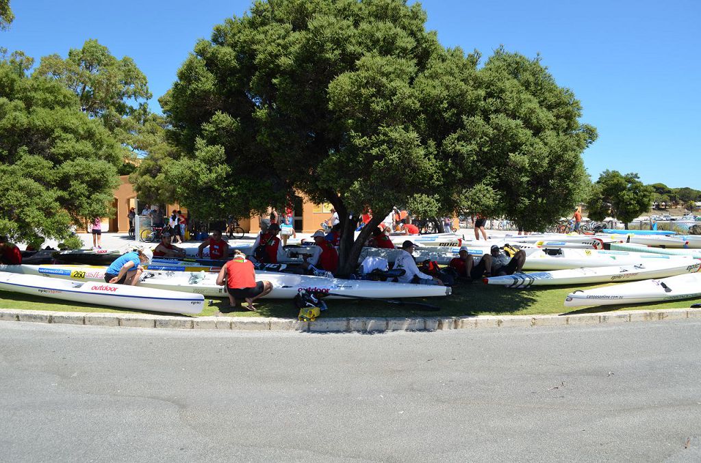 Saturday, at 10am, it was already classic "troughed out" Perth weather - everybody sweating and hoping for the seabreeze to rush in and save the day. Humid cumulus clouds were building over the mainland - pretty much a seabreeze killer. Competitors were camped under any shade they could find, and some were found rigging inventions to carry more water on the journey across.