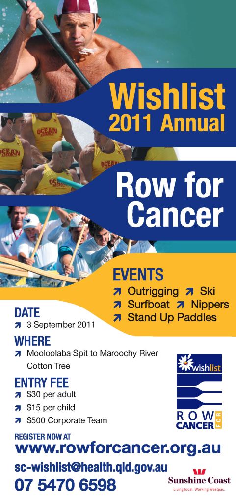| The 6th annual Wishlist Row for Cancer on the 3rd September 2011 will continue to raise funds to support local cancer patients. Combining sun, sand and the beautiful Maroochy River the event draws hundreds of competitors from as far away as Townsville to compete in surf boat, stand up paddle, outrigger, ski and nipper races for a cause that touches us all. While the Maroochy River will be full of competitors the corporate sponsors will experience one of Sunshine Coasts outstanding restaurants where the food is as fresh and exquisite as the location. Enjoy the day kicking back while supporting local cancer patients and their families on the Sunshine Coast. For more information, please visit our website www.wishlist.org.au / Row For Cancer |