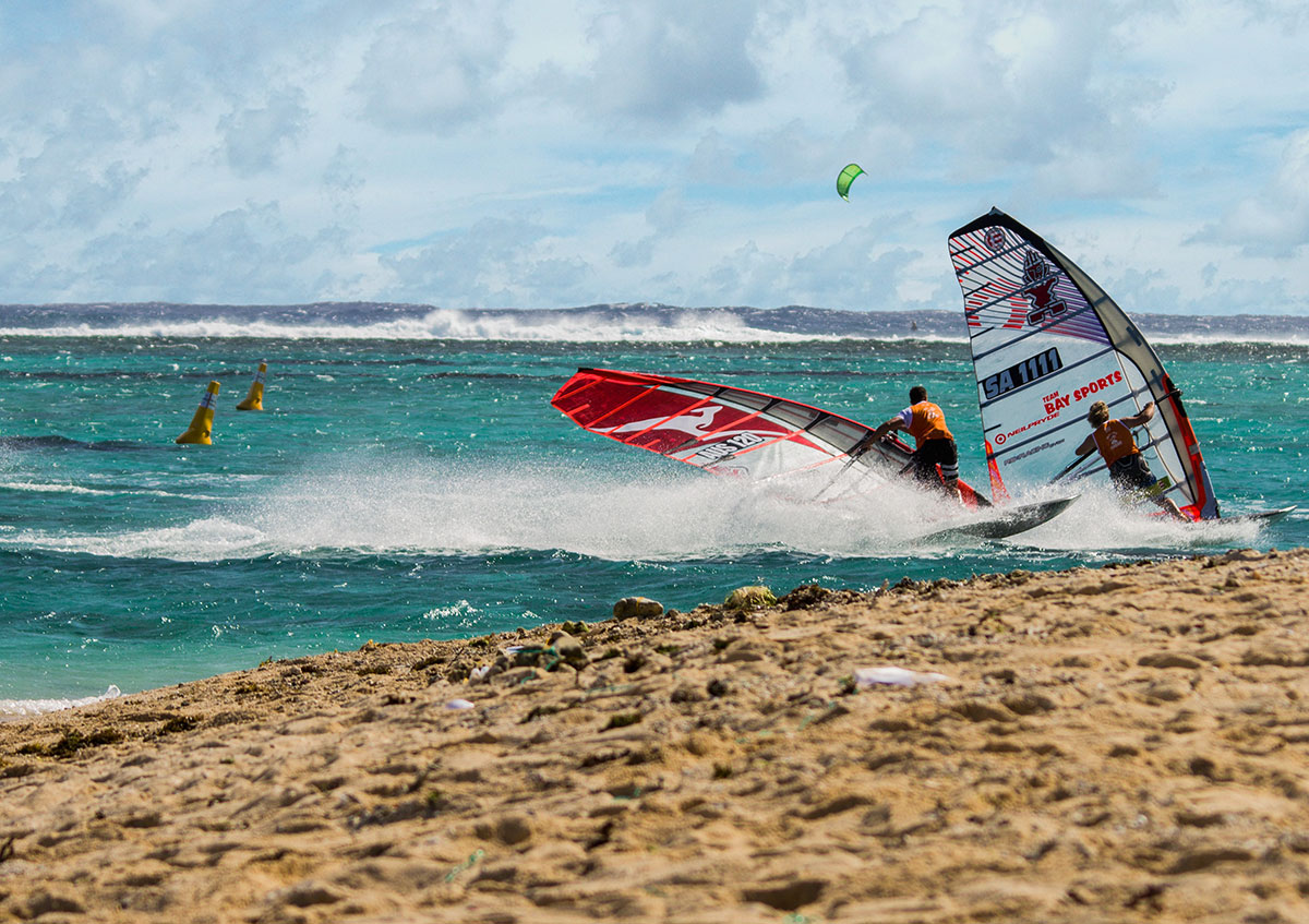 The event kicked off at the famous wavesailing break on the south-western coast, Le Morne for the Malibu Classic. A radical break boasting some of best wavesailing the southern hemisphere has to offer, with huge swells breaking over razor reef surrounding a flat-water bay – perfect for slalom racing! The short downwind course started with a ‘Le Morne style’ beach start; competitors running 15m down the coral cluttered beach with gear in hand before entering the water for a 4-gybe course finishing only metres from the beach right in front of the eager spectators. Antoine Questel from France, finished the day on top winning the last final, despite Julien Maurel and Fabrice Leclezio, the Mauritian hotshots giving Questel a run for his money and beating him in the first final. Sean O’Brien was 4th overall with a 5th and a 4th in the two finals with Luke Baillie in 11th overall.