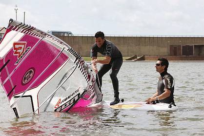 Pop Star Peter Andre and his brother, Mike, were down in Hove, on the south coast of England, filming for his reality TV show, and dropped into the Baker Academy for some windsurfing lessons from long term PWA star Nik Baker. Naturally, the paparazzi were out in force, and like everything Mr Andre does these days, the pictures and story made it straight into the pages of the nationals.
