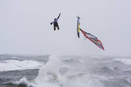 Alex Mussolini (Tabou) sailed a fantastic final to take the men's wave event in one foul swoop. Klaas Voget (Fanatic, NeilPryde, MFC) put up a strong fight after charging through numerous heats, but the Spaniard was fresh from the wrapper and ready to defend his single elimination victory. Mussolini landed some stylish jumps throughout, and in the final few seconds put the final nail in Voget's coffin by spinning round a sweet taka. Mussolini knew he had won and was celebrating as soon as he touched Sylt's golden sands.