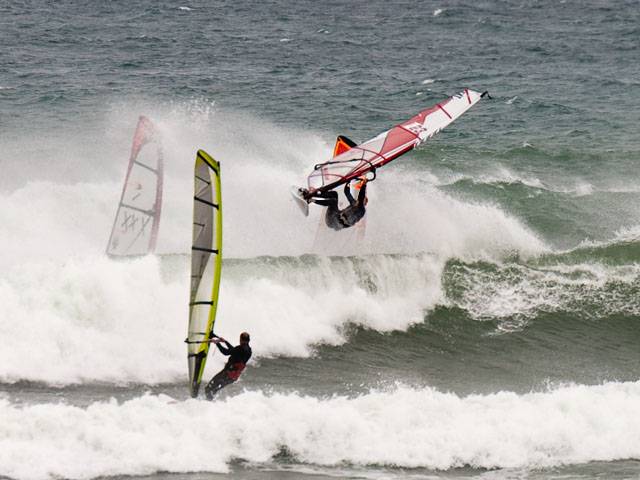 The Monday and the travelling convoy made its way in dribs and drabs (depending on the state of hungover-ness) down to Kina Road. About 12:30 the wind picked up from the north and Thomas (who else.) got out there to show us it was definitely sailable with the swell providing waves up to about half mast. In the space of about 10 minutes the number of sailors on the water went up to about 30 and the contest was on!