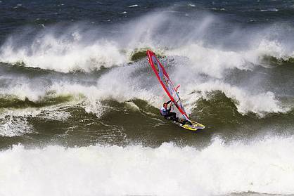 The second of the big five was Hancock who had to fight his way past the local motley crew of Lars Gobisch (RRD, NeilPryde) and legend Lars Petersen (JP, NeilPryde) in their own backyard before taking on four times freestyle world champion, Jose 'Gollito' Estredo (Fanatic, North). Estredo had knocked him out the day before, so his victory there was one of complete redemption. Hancock stunned the judges with his excellent riding style, and once even smacked a thick North Sea lip so hard it looked like it would snap his miniature board in half! Hancock also endured the frustration of heading out for his final heat time after time, but will be back tomorrow with a new lease of life.