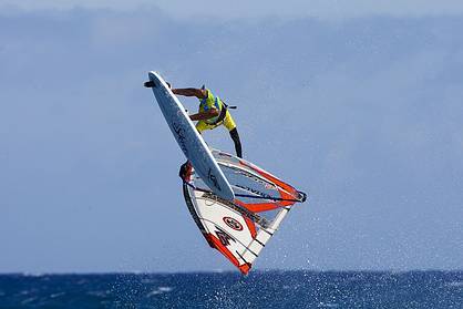 Andre Paskowski (Fanatic/North Sails), Nicolas Akgazciyan (Starboard/Gun Sails), Ian Mouro Lemos (JP/NeilPryde) and Maarten Van Ochten (JP/NeilPryde/MFC) each cruised through their first rounds, it was soon evident that the super-styled new school were going to prove tricky to beat in the later stages. First blood was drawn when a strong Marcillo Browne (Fanatic/North) felled the ultra-talented Michael Ro?meier(Exocet/The Loft) in the day's first split-decision, thanks to a flawless combination of culos, double flakas, and conos. Later, Anthony Ruenes (Tabou) was put to the sword despite sailing brilliantly against the outstanding Jose Estredo (Fanatic/North Sails).