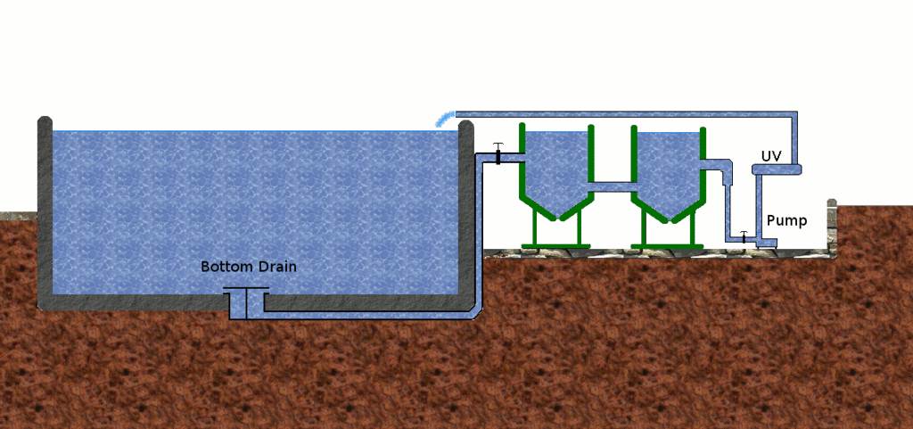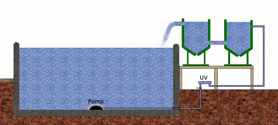 (don't use a 'sump pump', they will break down within 6 months) Great point the pond design especially outdoor will accumulate sand etc so the (submersible pumps wear a lot quicker.) a better design is using gravity to filter application on a centrifugal (pool pump) as illustrated below ! This will provide more pressure & flow ultimately use less power.