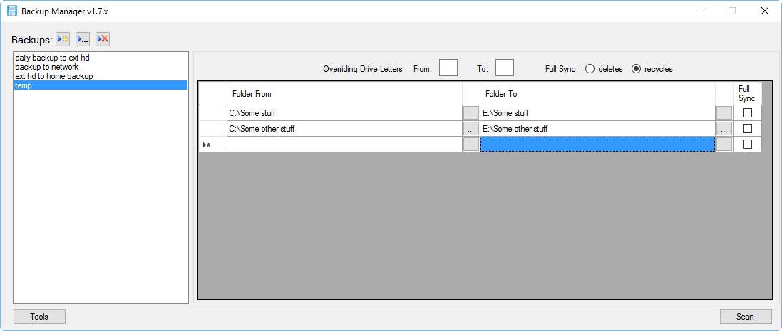 At the end of every day, or when I have the right combination of drives plugged in, I choose the save in the left window and hit 'Scan'. It checks for files that have different modification dates, or new files, and does a backup of those files only. If you turn on the "Full Sync" checkbox it will remove any files in the destination folder that don't exist in the source folder. It's quite agricultural but it works - on Windows 7 and Windows 10 anyway, I haven't tried it on anything else. Seabreezers are welcome to it for the low low price of free, just send me a PM.
