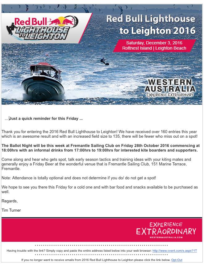 Red Bull and Tourism Western Australia are delighted to invite you to enter the 2016 Red Bull Lighthouse to Leighton, now in the event's seventh year of racing from Rottnest Island to Leighton Beach on Saturday 3rd December 2016.