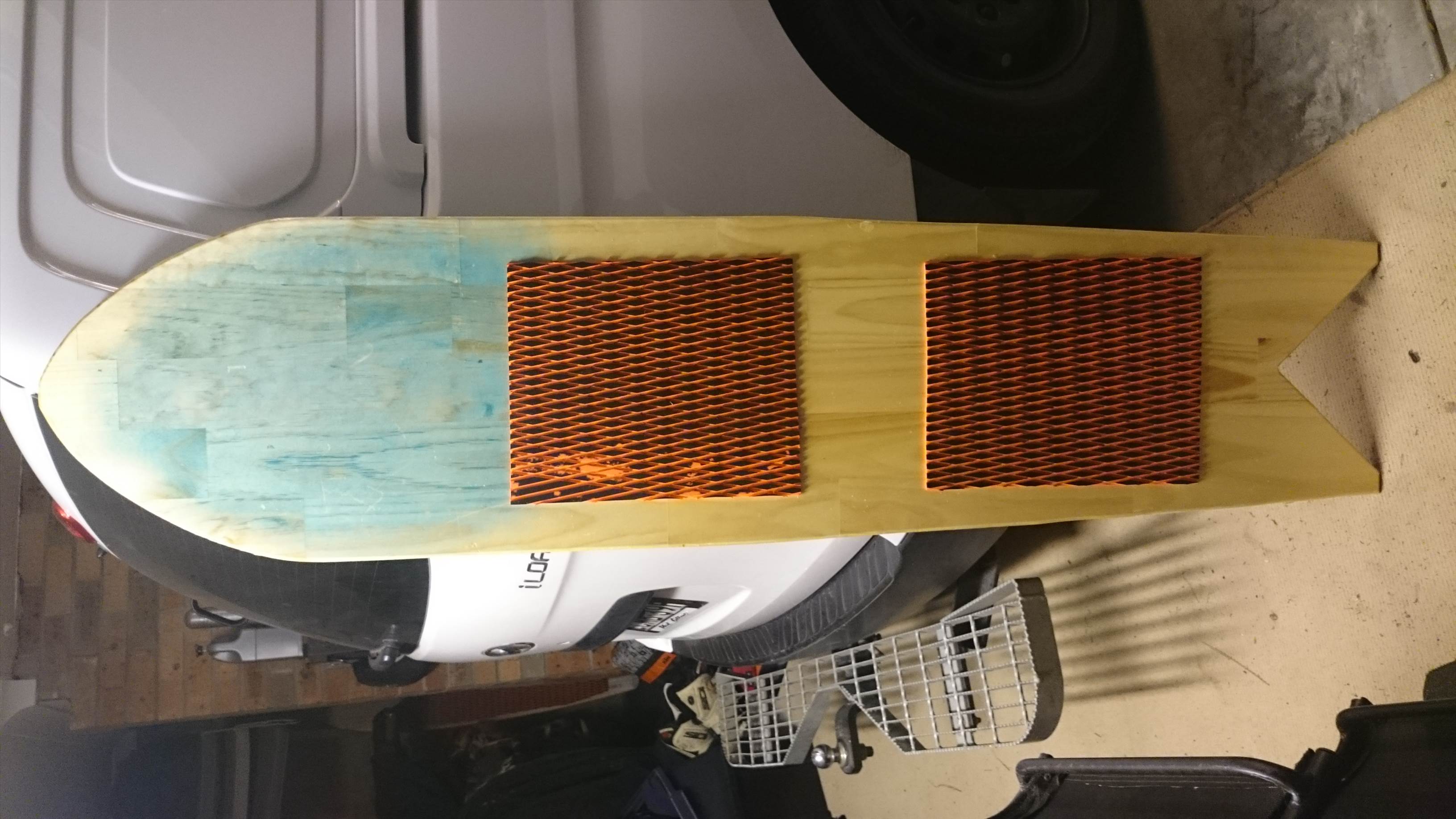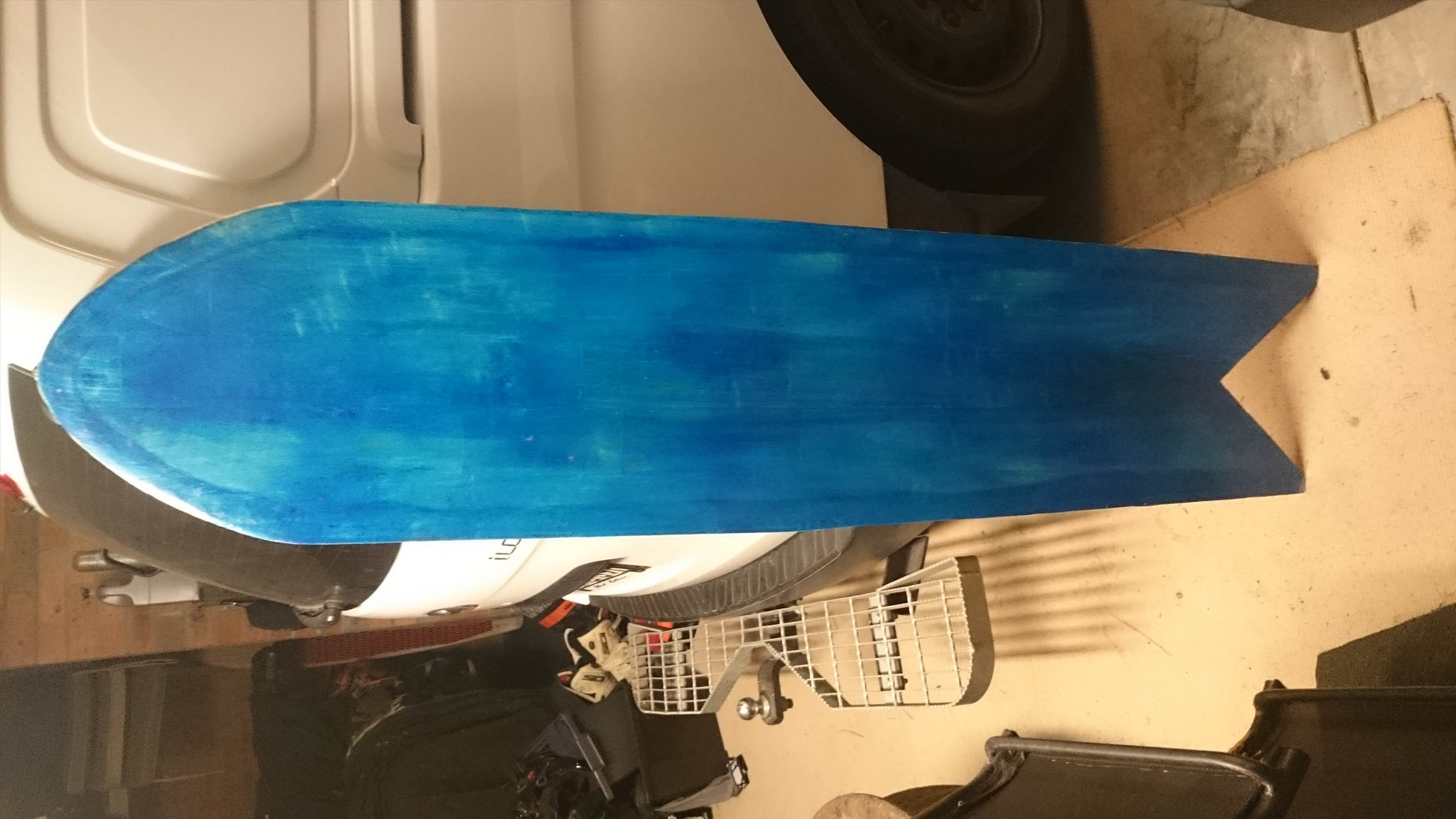 I cut it down to 500mm wide into an Alaia shape (roughly like the Naish beast without the waist), added a point, a fish tail, some glass on the bottom and resin on the top to seal it (bunning glue is does not like water!!!).