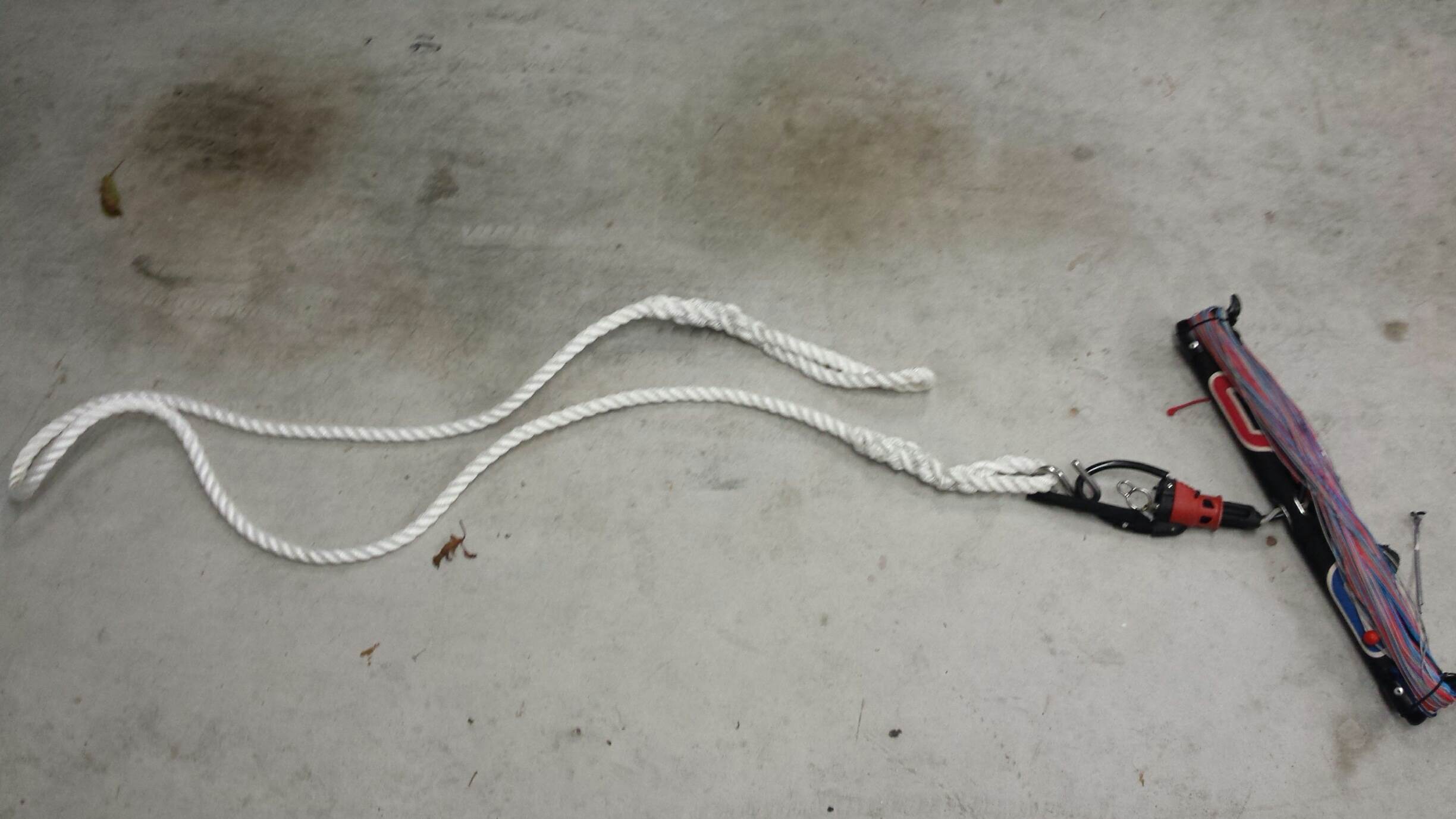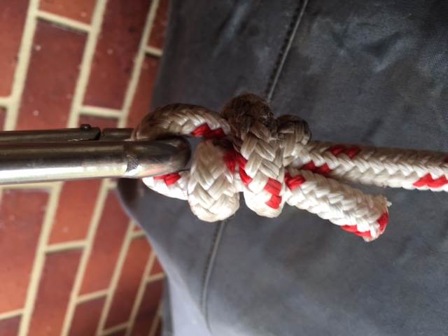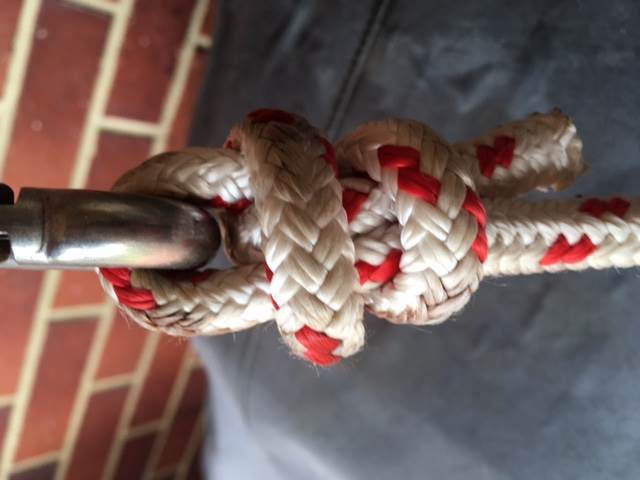 Some time back a random bloke asked if he could use my tether to launch his kite from. Anyway to cut a long story short, after using it and then chatting to him sometime later, he said that he didn't like the knot that I had used to attach the clip to the rope and that he had re-done it with a rigging/climbing style knot that is better. He was definitely right, as once this thing locks in it is not going anywhere.