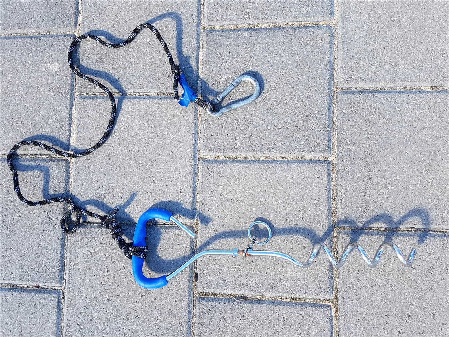 I use one from a pet shop. Just need to remove the soft sand and screw it firmly into the harder sand. Attach your kite bag so you find it again and others don't trip over it. And when tethering of course depower the kite plus push out the bar, and walk along the upper middle line to the kite or back respectively. That avoids the kite going up to and over the zenit which may pull out the screw. In crappy small onshore beaches or beaches full of crap like rocks, branches etc I use such screw. On a clean sandy wide enough beach I self launch/land.