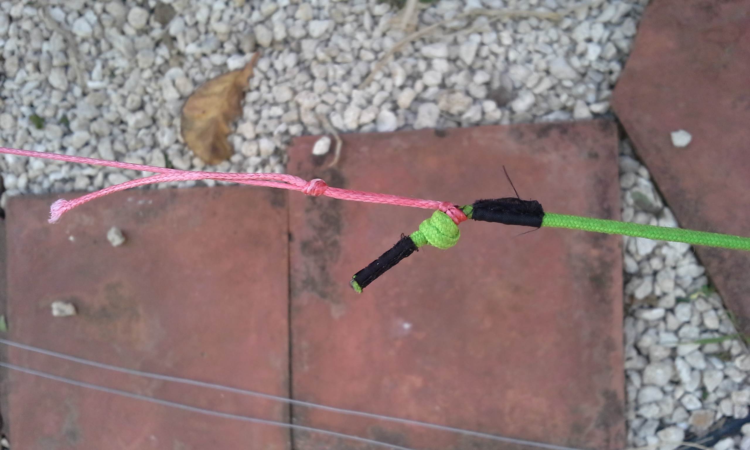 Bought a second hand kite and bar today (Wainman Punch 2.0), bar had one line replaced by previous owner. I didn't really give it too close of a look because 1) I'm an idiot 2) It was windy and I wanted to hit the water. Later when I checked it more closely I saw that it's not sleeved, it's tied like this:
