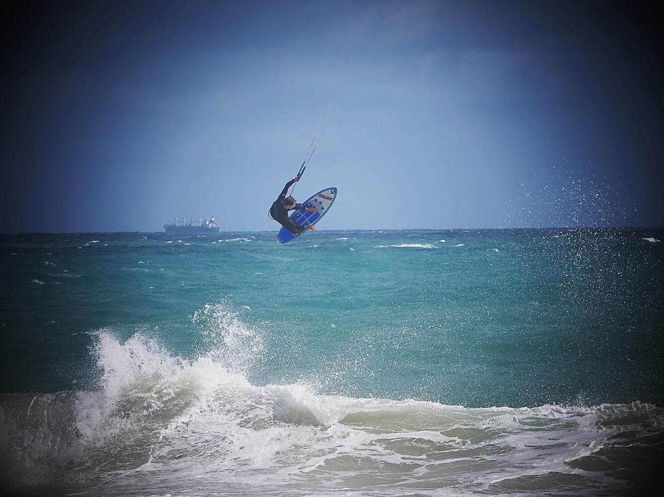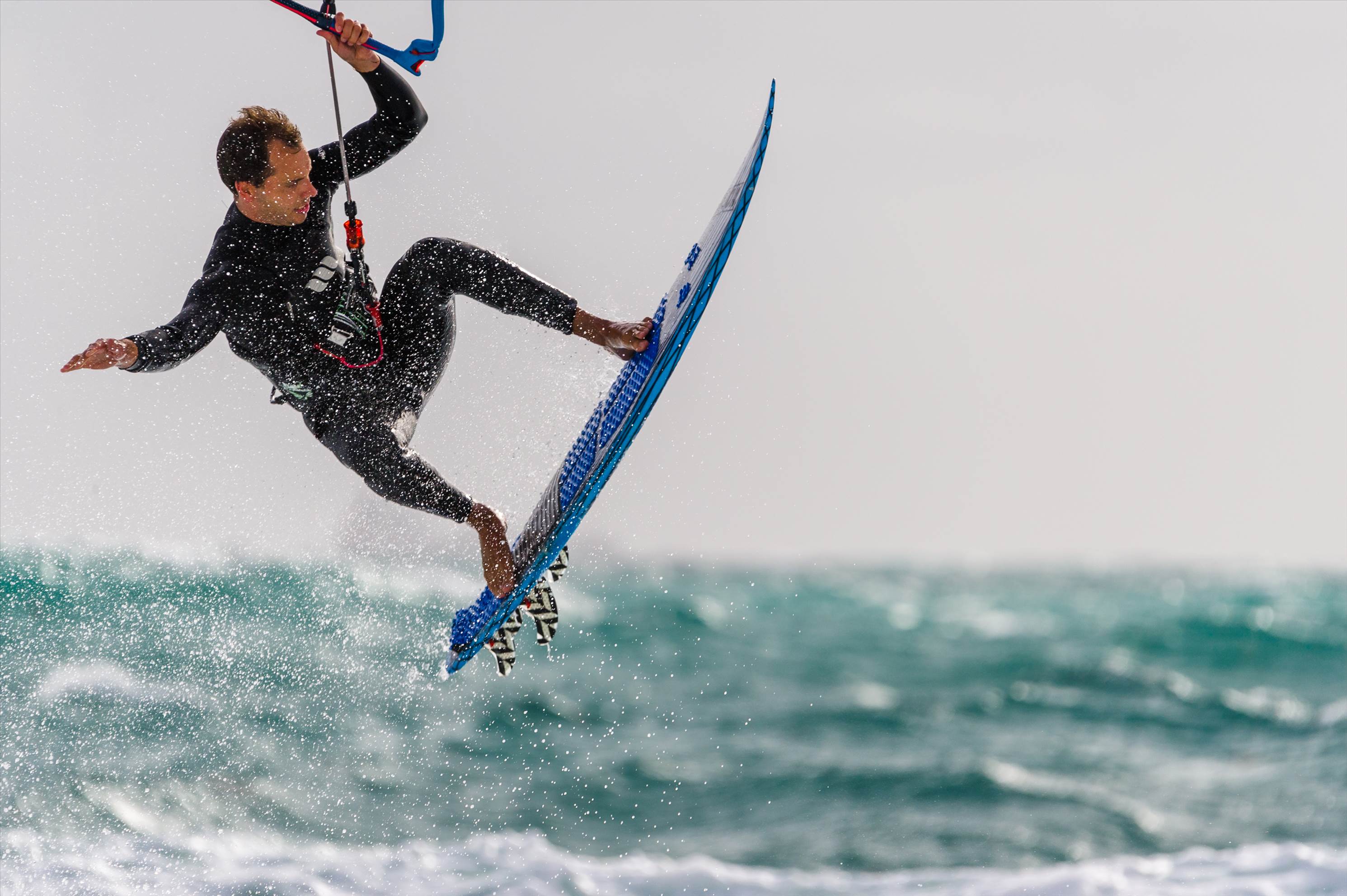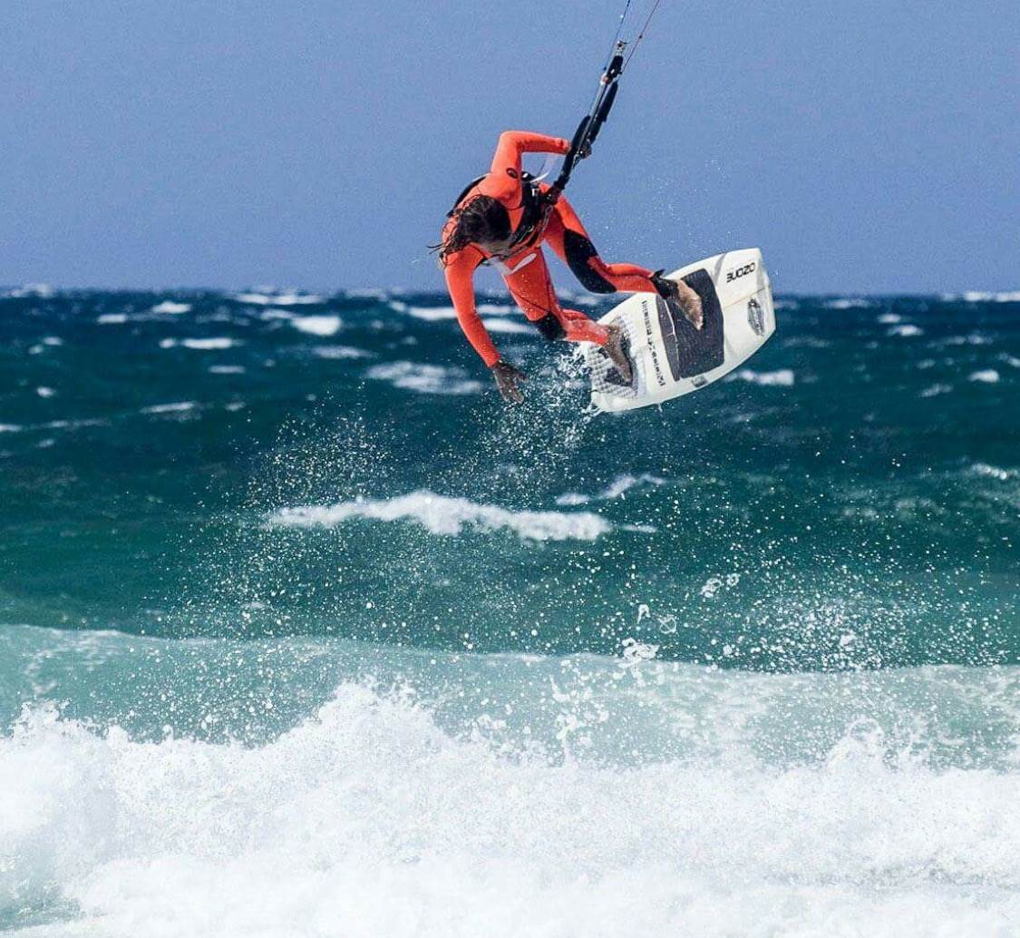 Only back hand on the bar, spot your ramp and scoop hard so when you launch the board is pointing up into the wind- at the same time sheet in and send it up just a little, if you do get a good bit of height/ airtime it is important to keep the bottom of the board pressed into the wind with your feet , as you start your decent swap hands on the bar ( back hand off front hand on) this helps to direct the kite for landing and rotate your body downwind for the landing, at the same time you will need to press your back foot on the tailpad to rotate the board to land downwind