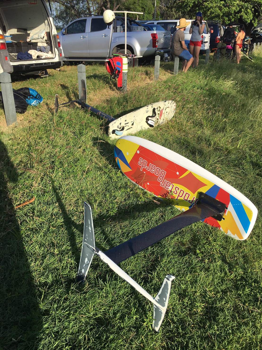 Now to test ride. I’ve not foiled for over 3months having been away overseas for most of that time. I mated the foil to a TMV board designed by Marvin (154x41) this board looks so small compared to my previous TMV fat-boy. How am I ever going to ride. My foot is as wide as the back. I setup the foil as Marvin suggested ie back strap front screw over the back of the mast trailing edge. Wind was 15-18knts (gusts of 20) on the river. Wow amazing got up first time and on the plane in seconds!! The stability is amazing, upwind there is no twitch as one loads the foil up (I’m 92Kg 190cm) and high AoA, down wind so stable. I didn’t push too hard as t's my first time out for months plus no impact vest. Tacking and gybing is so much easier on a stable board, one can pressure up the foil and it doesn’t wobble. The board although small is so stable on touch down plus the ‘pop-up’ is so quick, even at speed it’s smooth, never nose dives even with a hard pressure nose down hit/smack. The foil does screech but that will be eliminated with an overall sanding, especially along the trailing edges.