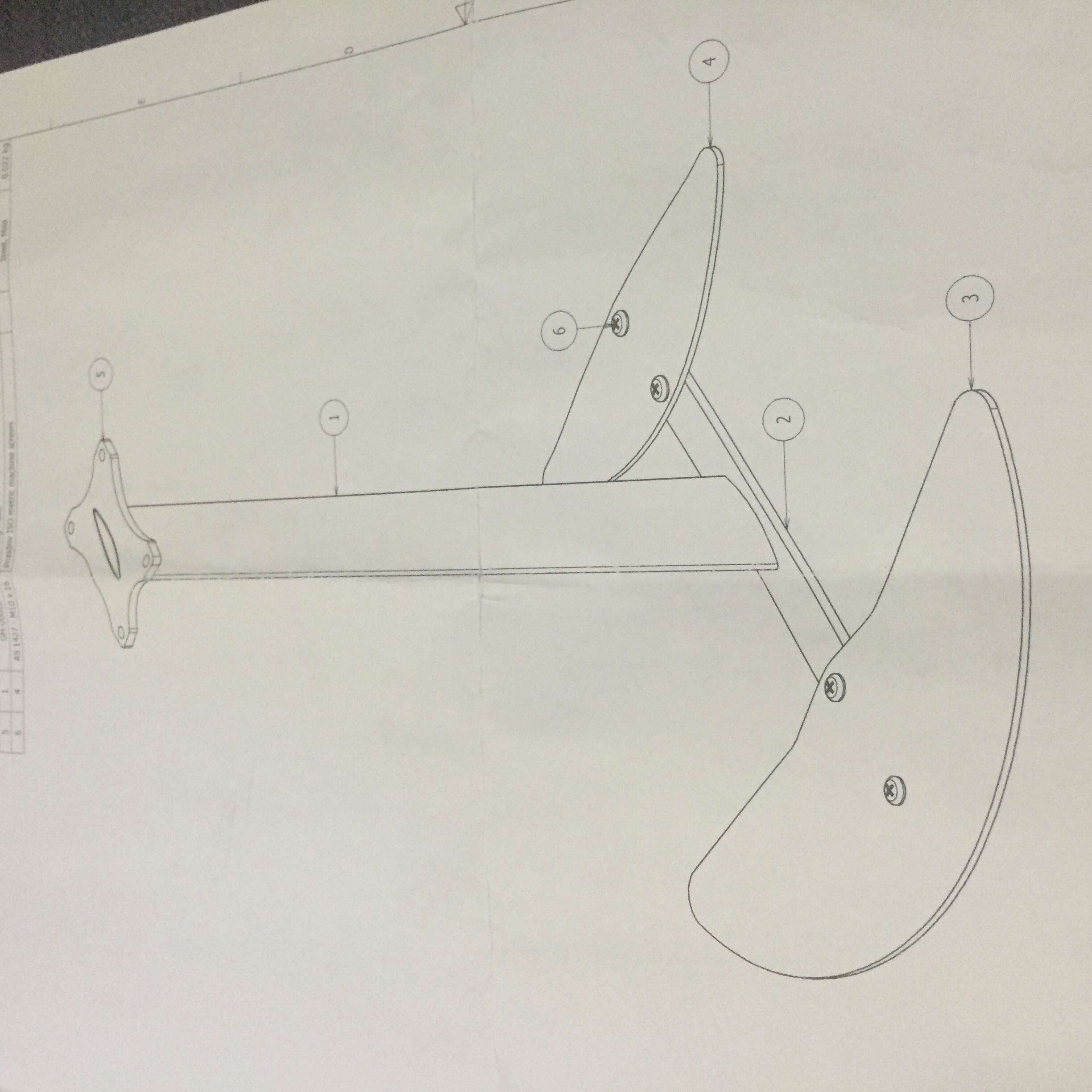 IIRC you want the TE of the front wing closer to the LE of the mast, the rear fin above the shaft and the front of the shaft extending out in front of the LE of the front wing, like on big boats.