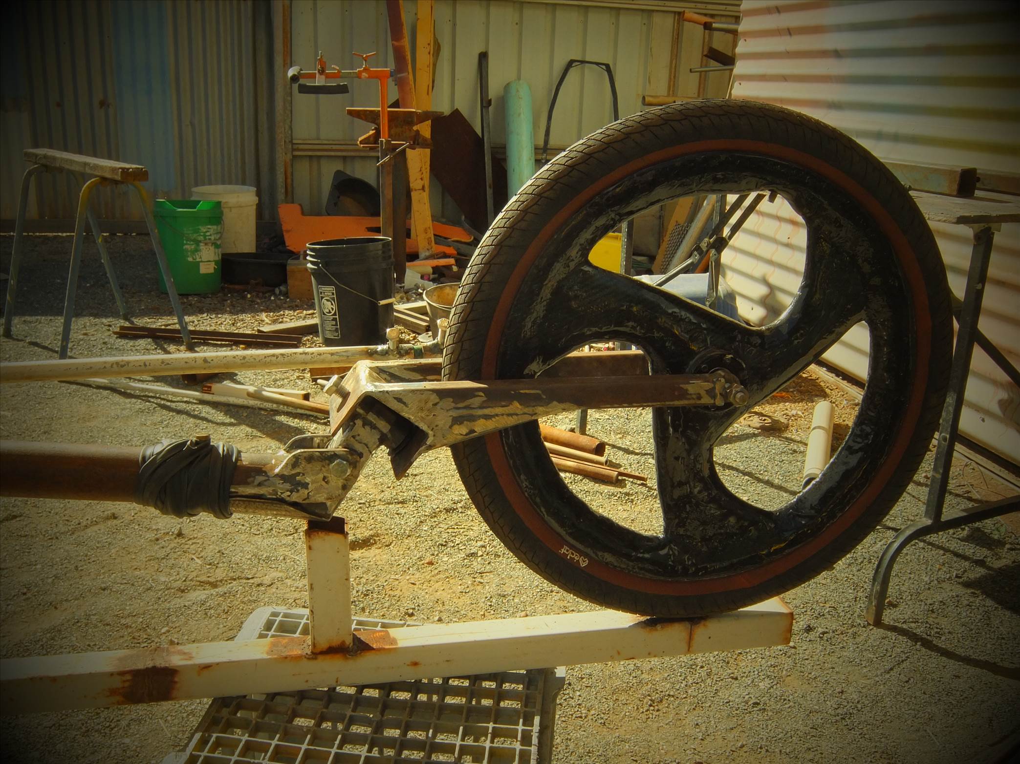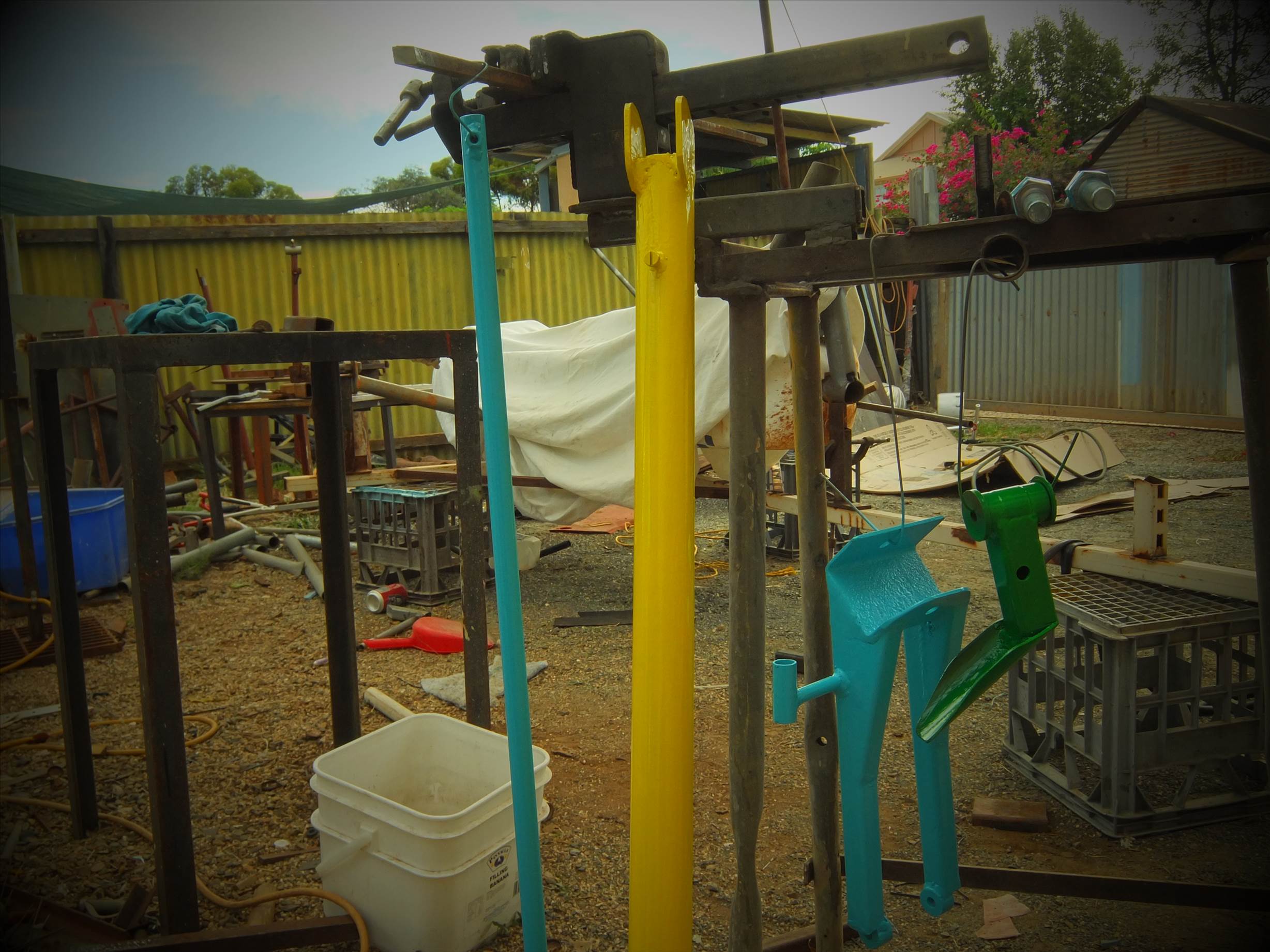 started the fork set up today but it was sooo hot down the back. had to cool the bits off in water buckets in between cuts and welds.