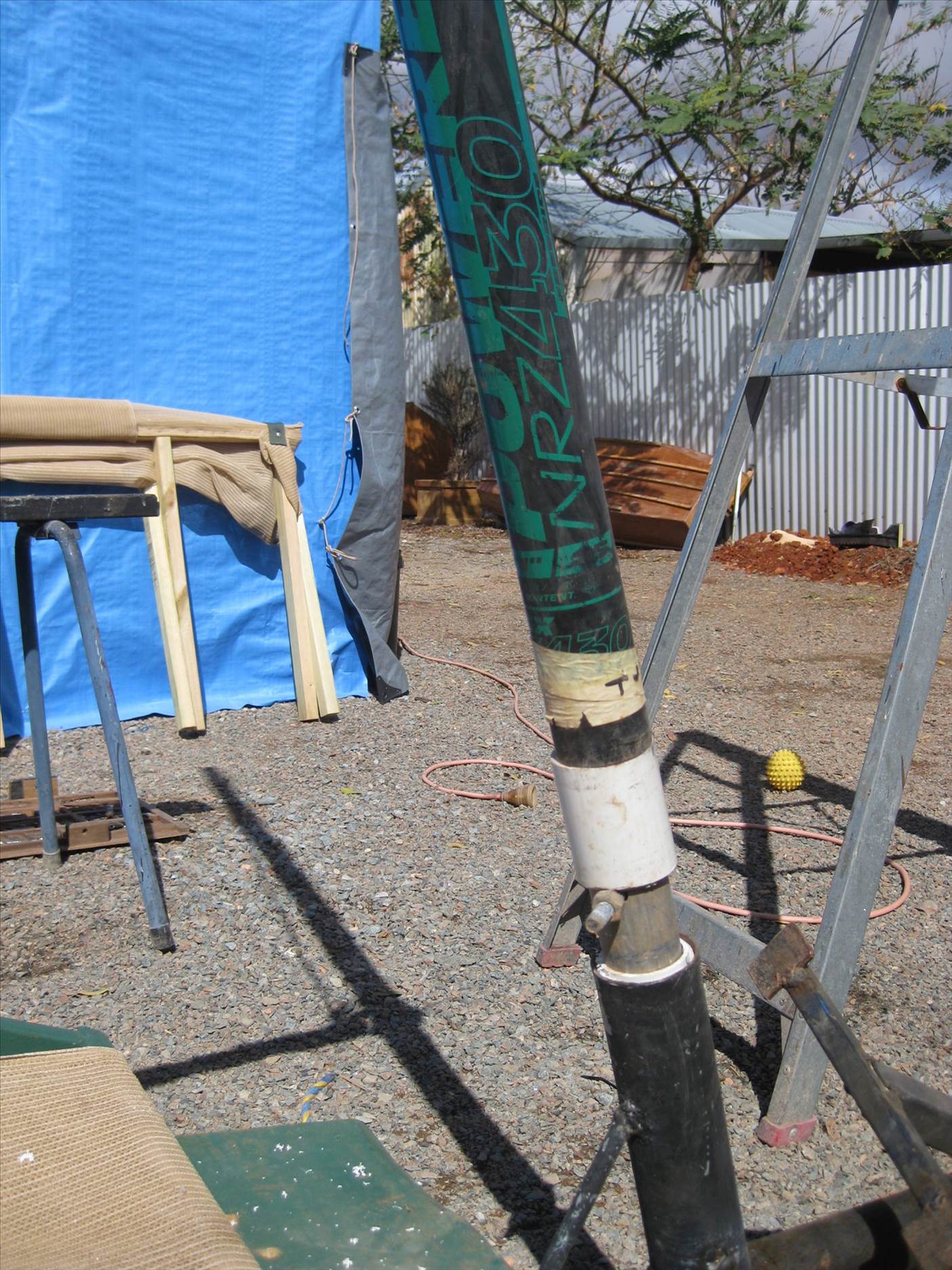 I inserted the top half of a second carbon mast into the base of my main mast. Start by pushing a tight non porous foam plug down the base of the main mast about 50mm further than the length of the mast top top insert. Set the plug in place with about 100ml of 2 part urethane. Once your plug has set pour about a 1L of urethane into the mast then insert the mast insert. This process will stiffen the mast quite a bit up to a point just a bit highr than where the boom would attach on a wind surfer. The base of the mast insert is floating free inside the base of the main mast but the clearance is only about 3mm between the outside of the insert and the inside of the mast.