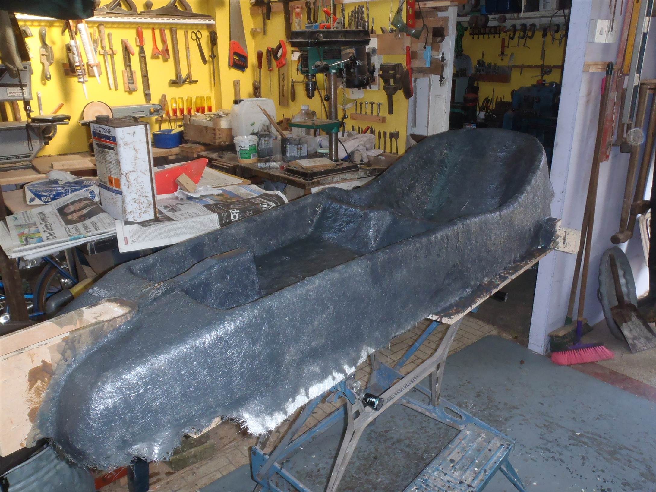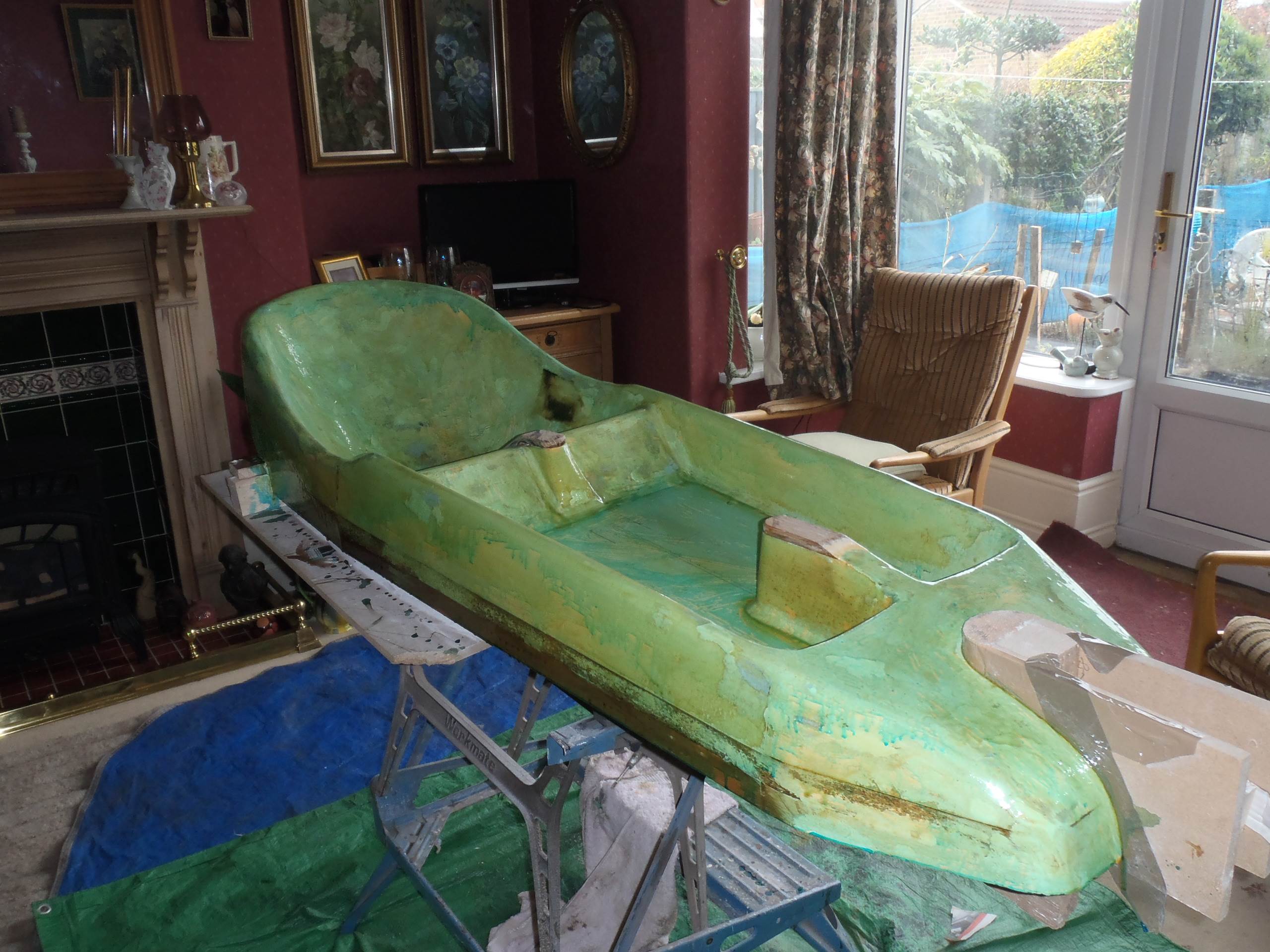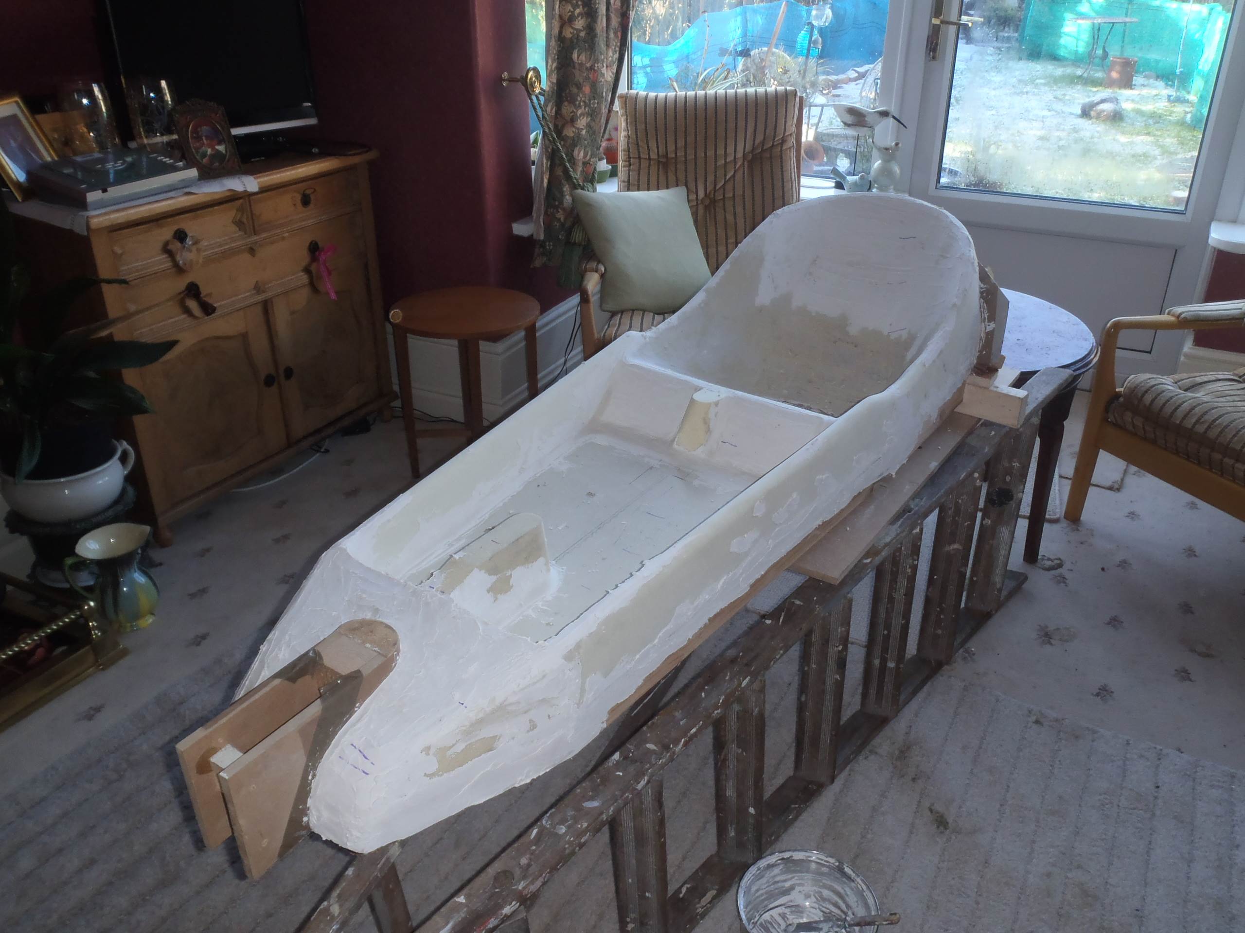 It now ready to go back to the workshop for three layers of 450gm CSM and then a top coat, hopefully this week but I need to get the temperature above 5deg so its very much weather dependent