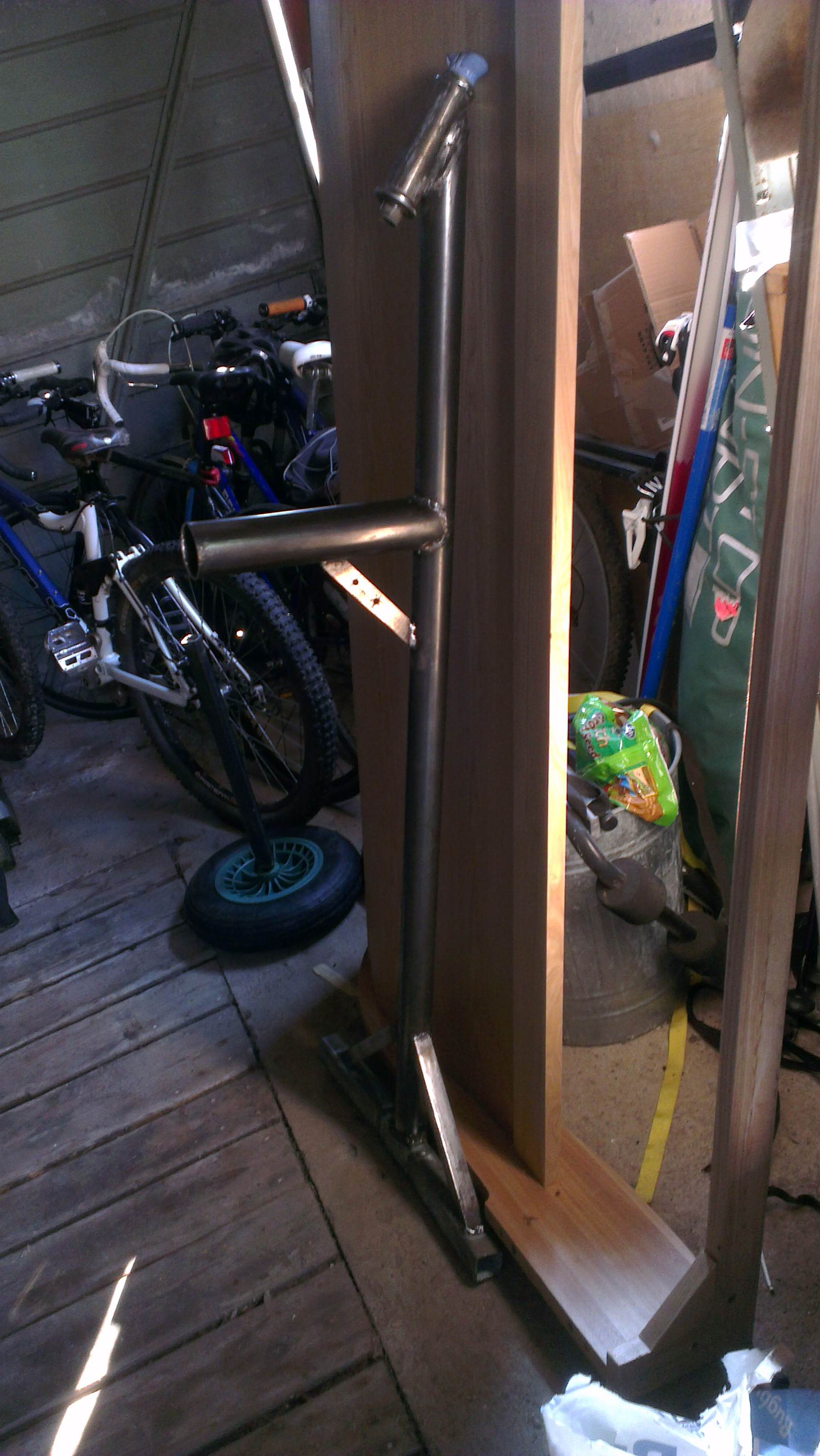 gizmo is right, weve built plenty of minis with Galv fence/sign posts. 1.6mm wall is ideal. try and get around 60mm OD and that will take your mast as well. regards the front fork, if you are using a bike wheel./axle you are going to need a double sided fork. our single sided forks have axles of 16mm or greater