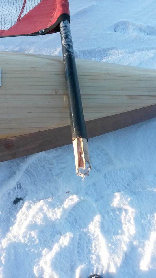 Barney, It was gusty and the ice was sticky. The day before in no wind I was sheeting in and heard a cracking noise. I think the wood dowel just gave up after 2 years. Going the aluminum route now. The stiffener thickness is about the same thickness's and diameter Ive seen in five square meter masts. I just ordered a 20' stick of it today. Should be here tomorrow.