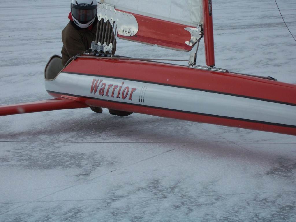 The front loader or bubble boat skeeters (sit in front) use laced sheeting that is connected to a winch inside the canopy area. Some of them use internal sheeting where you can't see much connected to the boom as far as purchase is concerned. That also goes to a winch. Most of us that dirt and iceboat with the same boat find you can't sheet as hard iceboating because the runners don't grip.