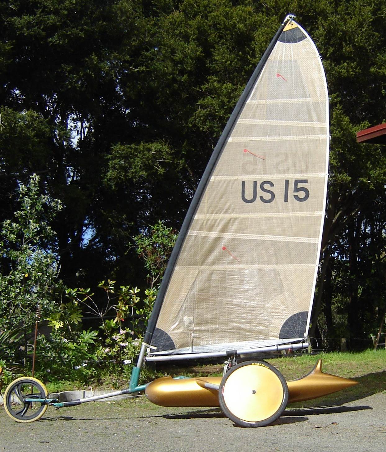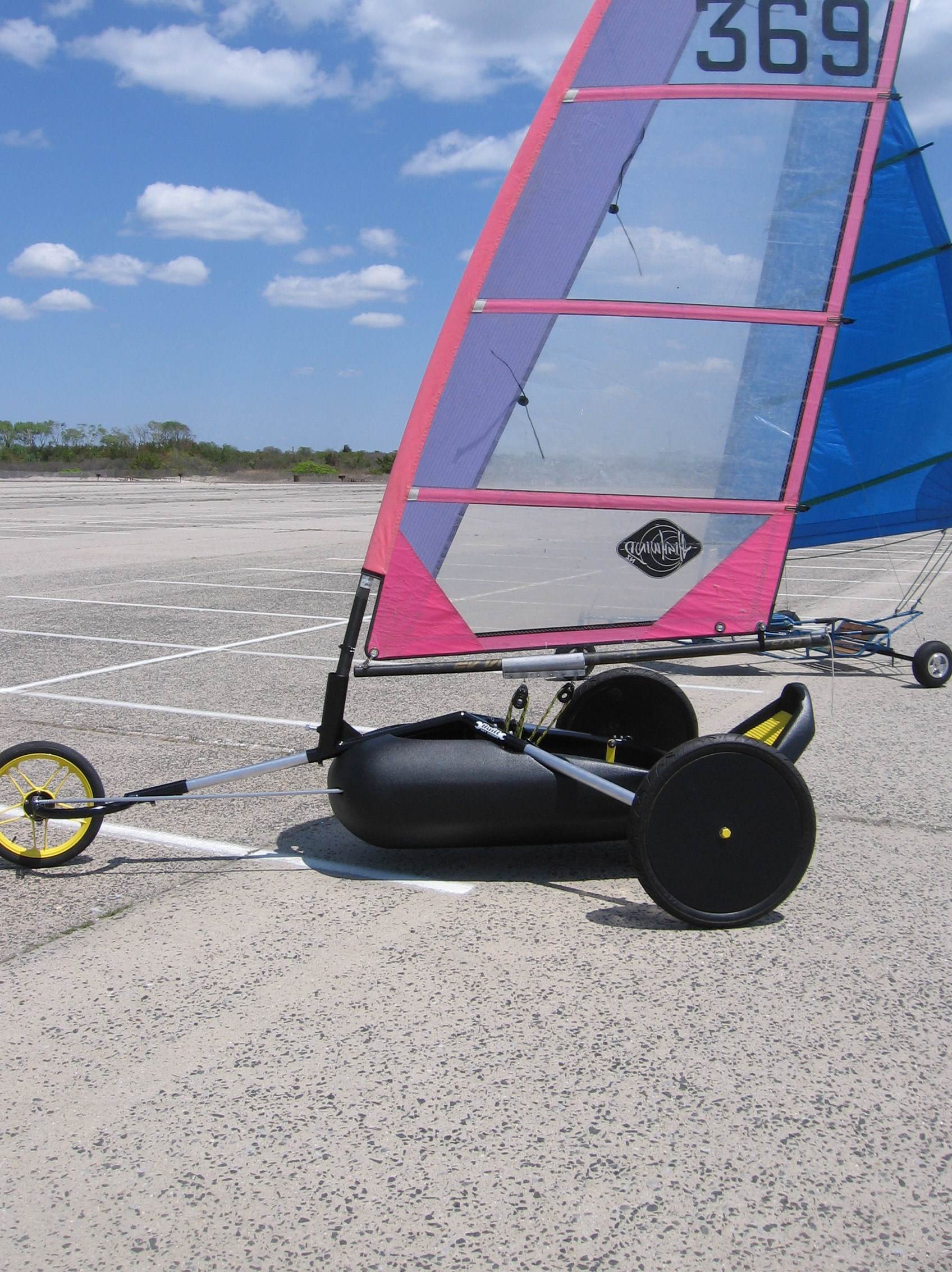 Cross wind the sail twists off above the 3 batten so they are very user friendly. 2 wheels are the norm on a broad reach. (lot less drag than 3