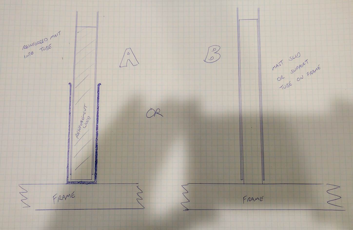 Hi, I just got a std diameter mast and some sails. I wonder is it better to reinforce the internal portion of the mast base with a length of wood and then slide mast base into a receiving tube on the frame ( A) or to have a longer tube welded to the frame that the mast would slide over (B)?