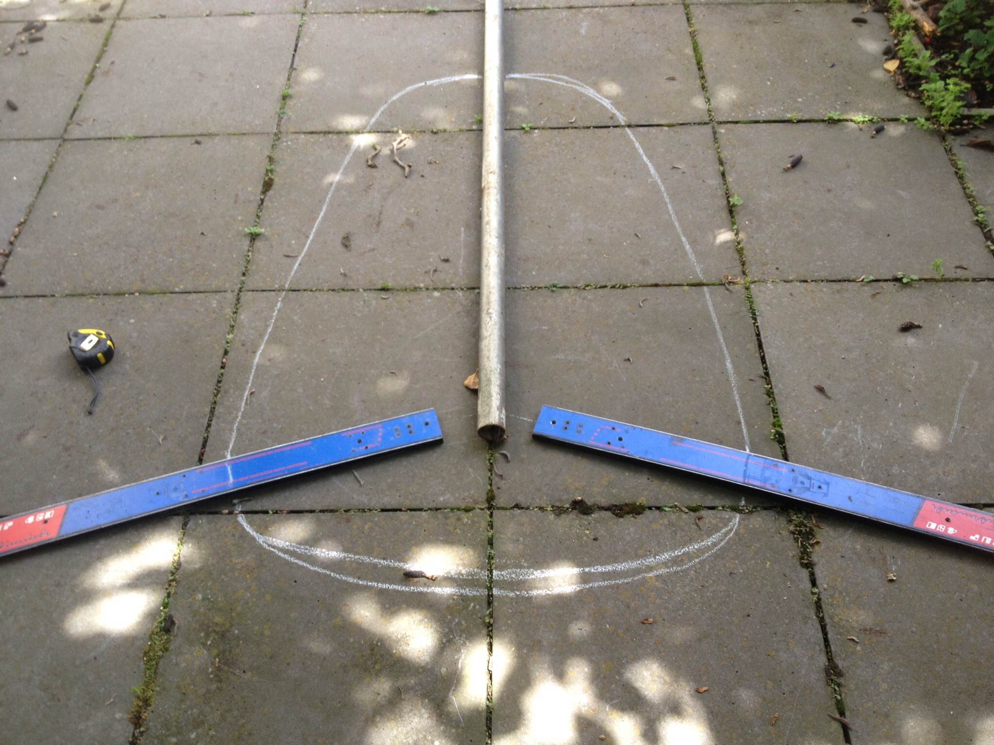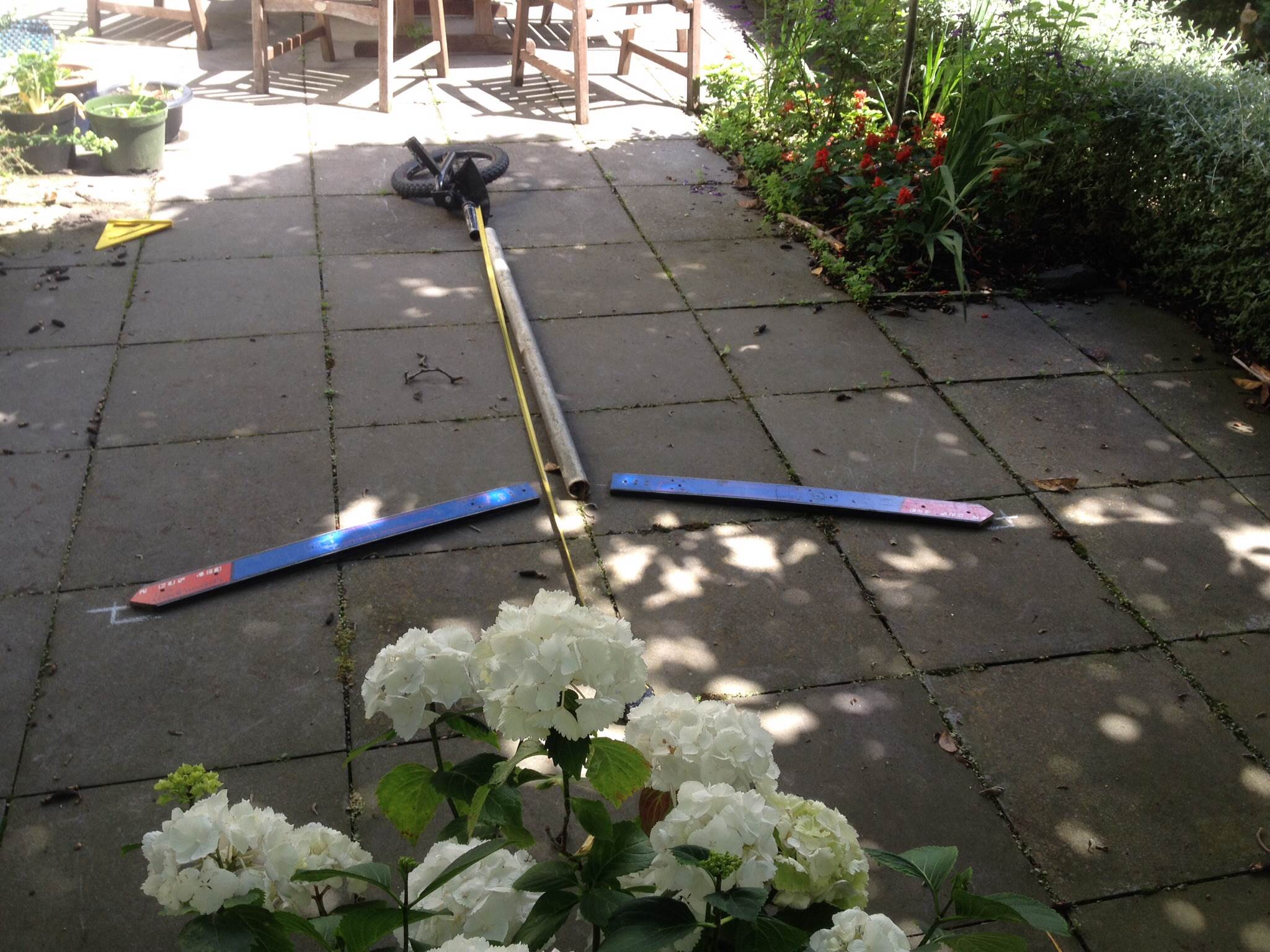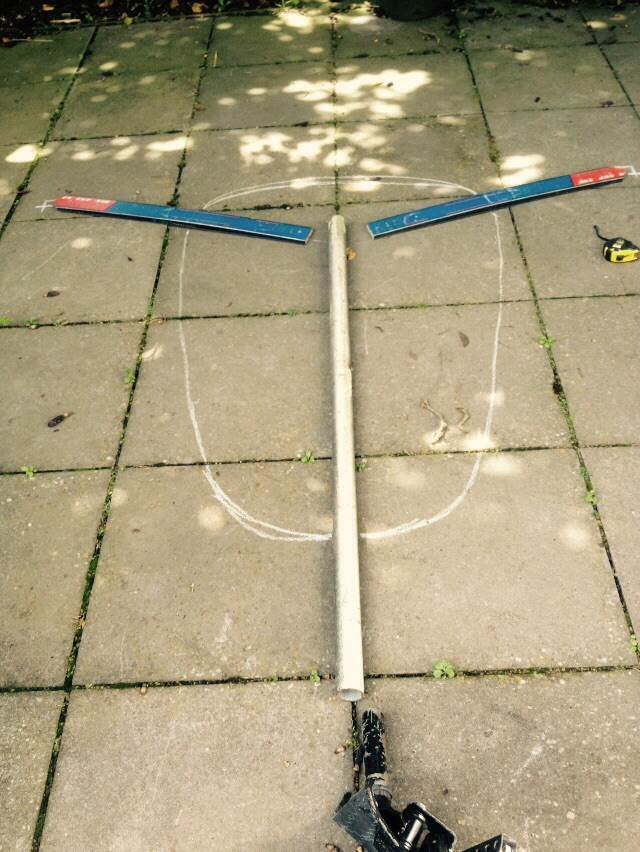 After consulting Clem the Clever, my tandem build will be a slightly modified version of Skiwi.The wheel base will be stretched out to 1800 and the v section for the skis will be at 20 degrees .I plan to redeploy the front wheel assembly and the rear wheels,the mast ,boom and sail,so the construction will be the spine,mast step, pedals and seat.I plan to make the seats the same way as the Skiwi build,sitting on a ply base about 900mm wide.Clem advises me to instal gussets to beef up the spine/v section assembly.I will probably instal one aft of the mast step with a hole at the top to use for a down haul securing point.I have the remaining section of 48mm pipe from the Skiwi build so I can get started