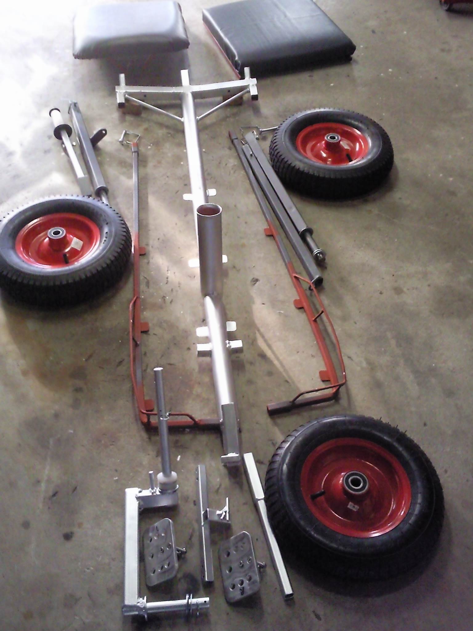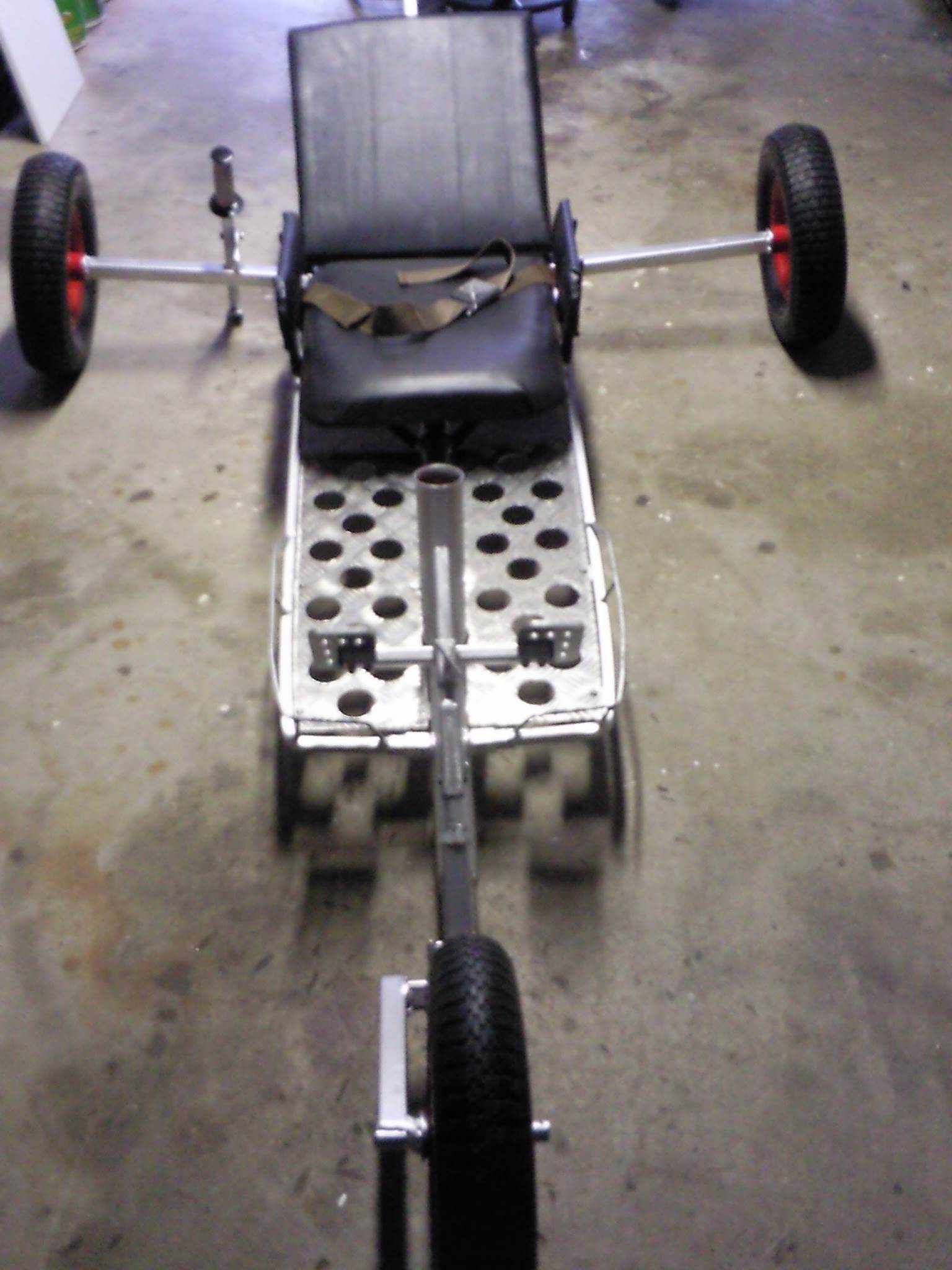 sisco you are right about the blokart similarities. Having only seen landsailing on TV a very long time ago and thought that it would be fun to have a go. With the sail, mast and boom I had from the windsurfer I started looking on the net for plans to build one. LLM and blokarts were the one I found. Looking through seebreeze I found a rolling LLM chassis picture, printed it off and started sketching seating and floor pans. I wanted to use a trampoline style seat because I thought it would be easy to remove and pack away. When I started to mock it up I found that with the T style chassis i would have had to mount the seat quite high so as to not be sitting on the main spine of the chassis. I didn't want a tub style seat bolted to the chassis and have to try and find a place to store it in the yard. As it is I can disassemble it in a few minutes and tuck it away in the garage and garden shed.