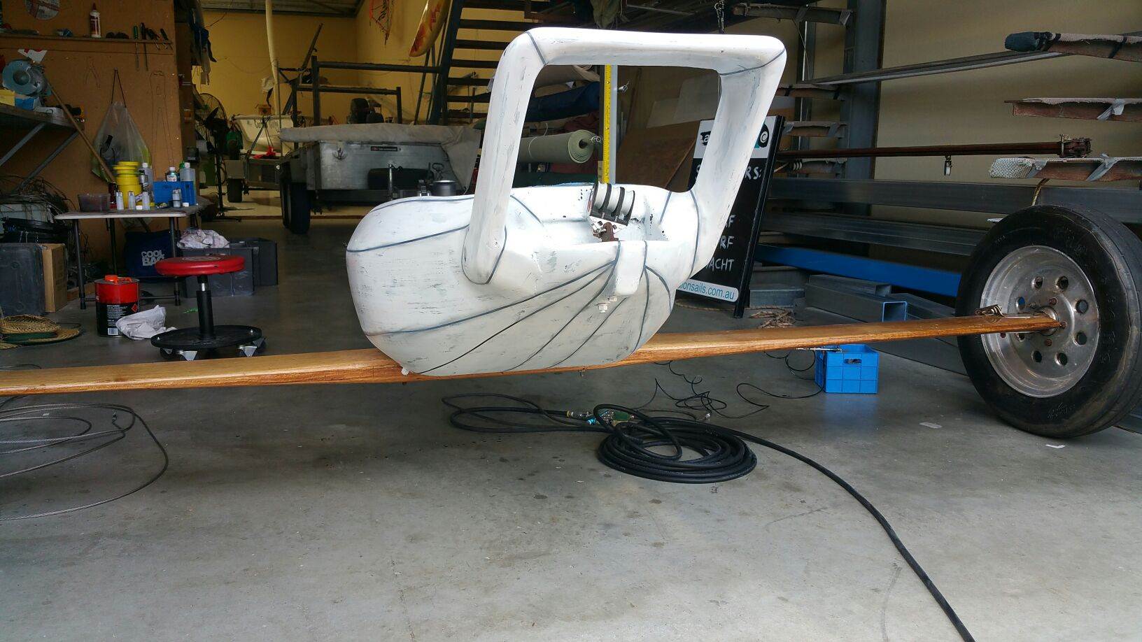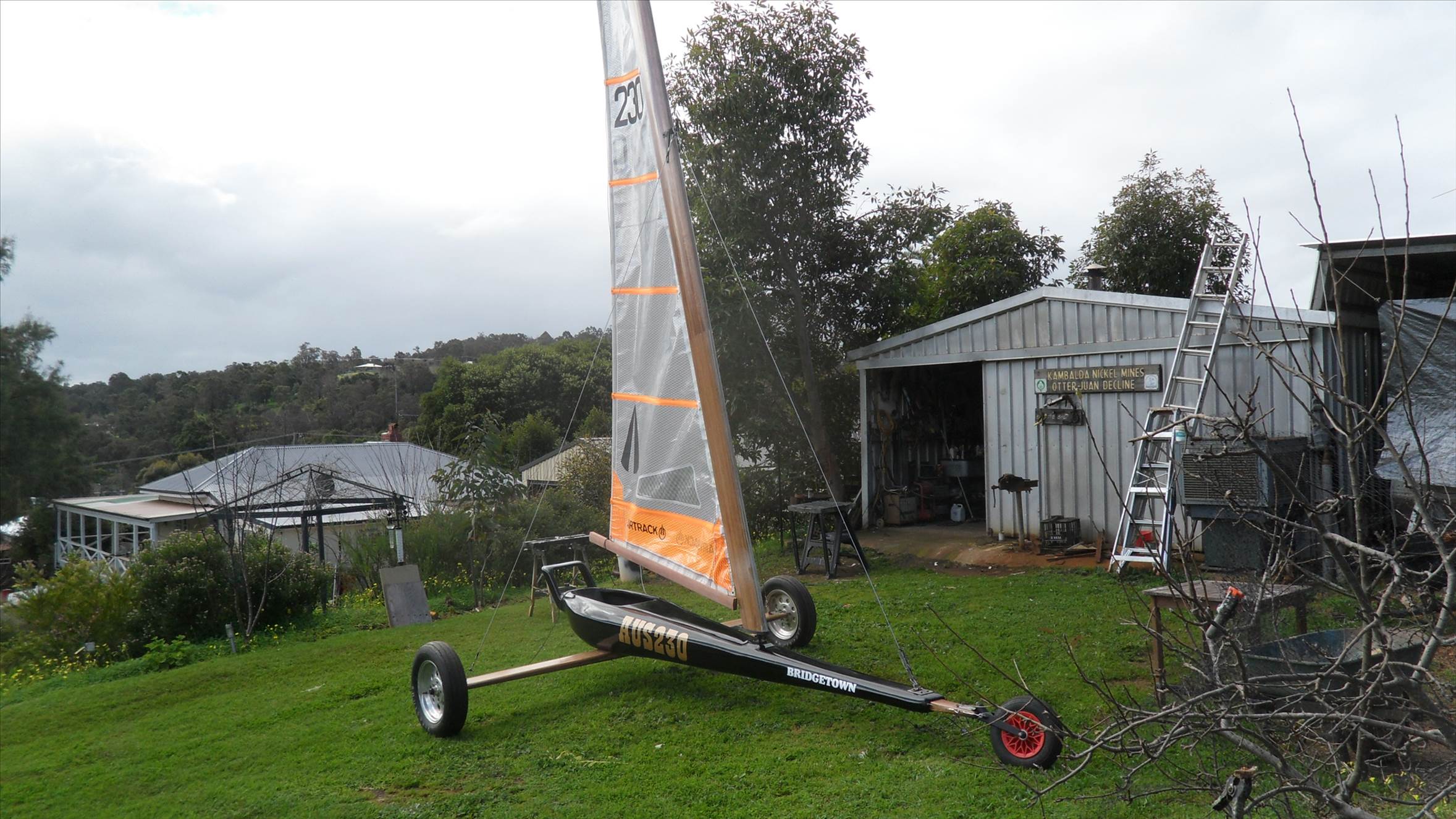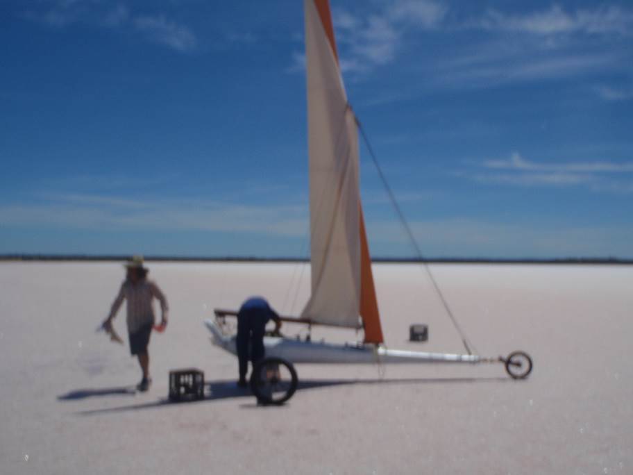 In kambalda it was decided that the mast boom and axle were not the right color so they were covered with a light color wood vinyl , still not happy and they were sprayed with flat clear to dull them down a bit. The wheels were changed to spoke rims. Crazy Trav came out to the Lake to help me get it set up for the first time.