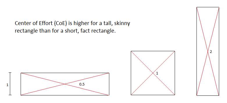 For example, the following rectangles all have the same area (4), and you can see that the CoE gets progressively higher as the rectangle gets taller