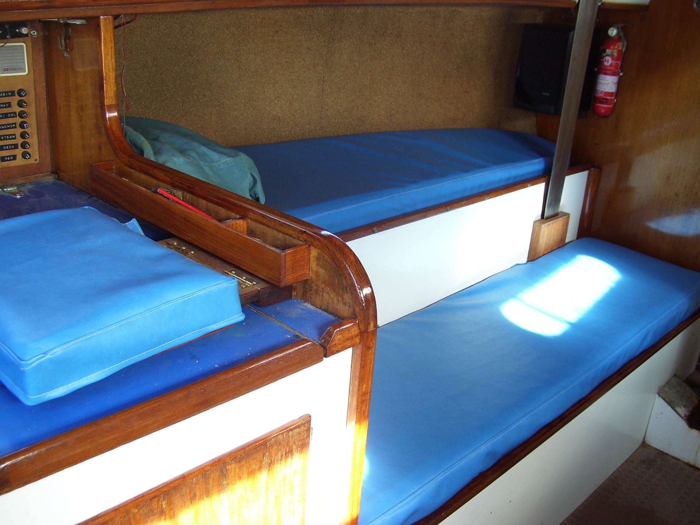 I made new covers for all my bunks out of the blue marine grade vinyl. Same stuff I use for all the other doodads about the place. I used the same stuff on my fishing vessels bunks and they look new still after 20 years of abuse. Used to sleep fully dressed in trawler garb and rubber boots of course. On my yacht it's fine as long as your not having bare skin on it on a hot day. The blue vinyl is thicker and easier to sew than the other colours for some reason.