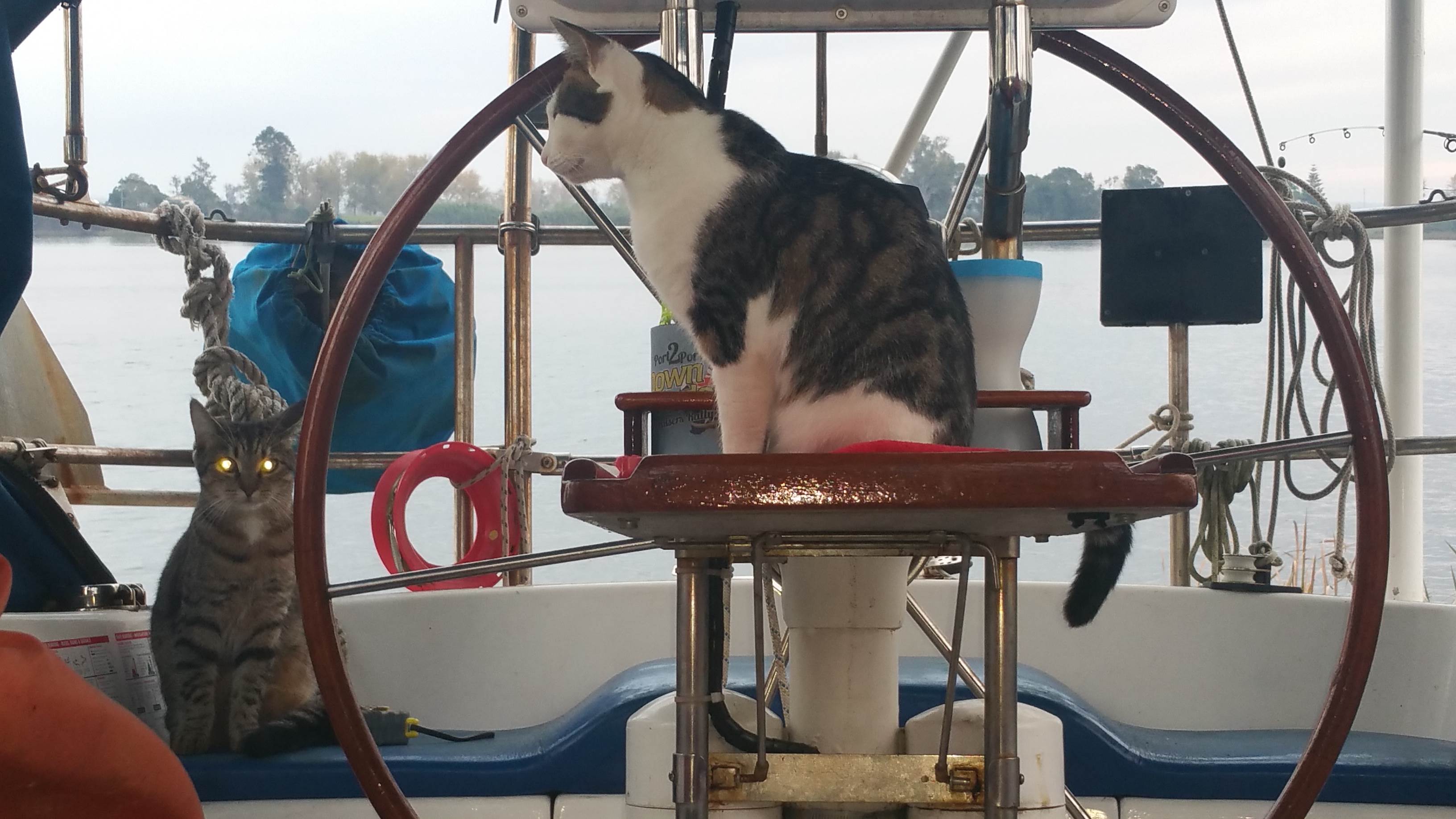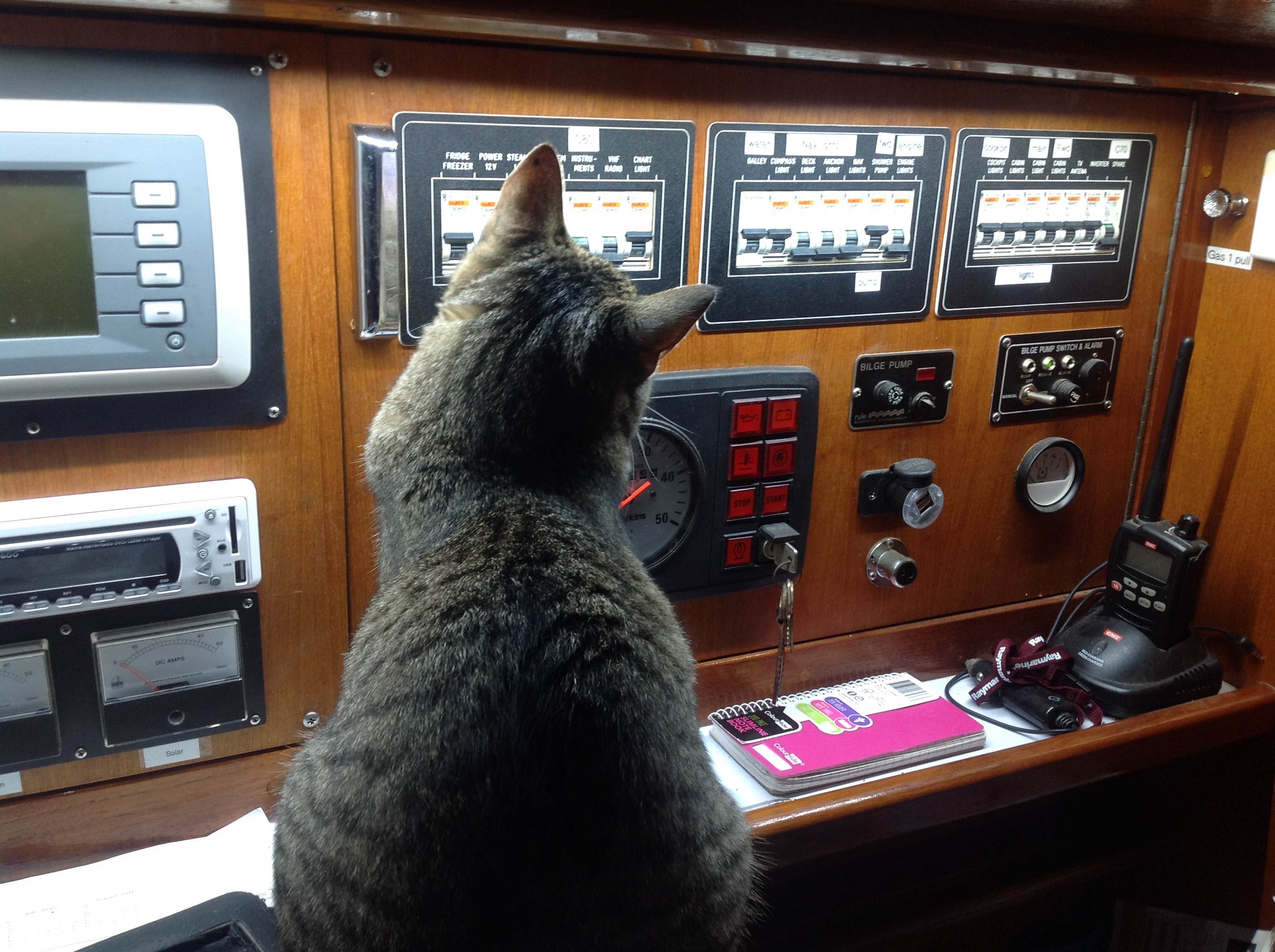 My Trm is slightly weird I think she's looking to turn cockpit lights off! Who knows! I fear she goes over and never comes back....it's hard work having a cat onboard permantly but rewarding! Welcome back girls!