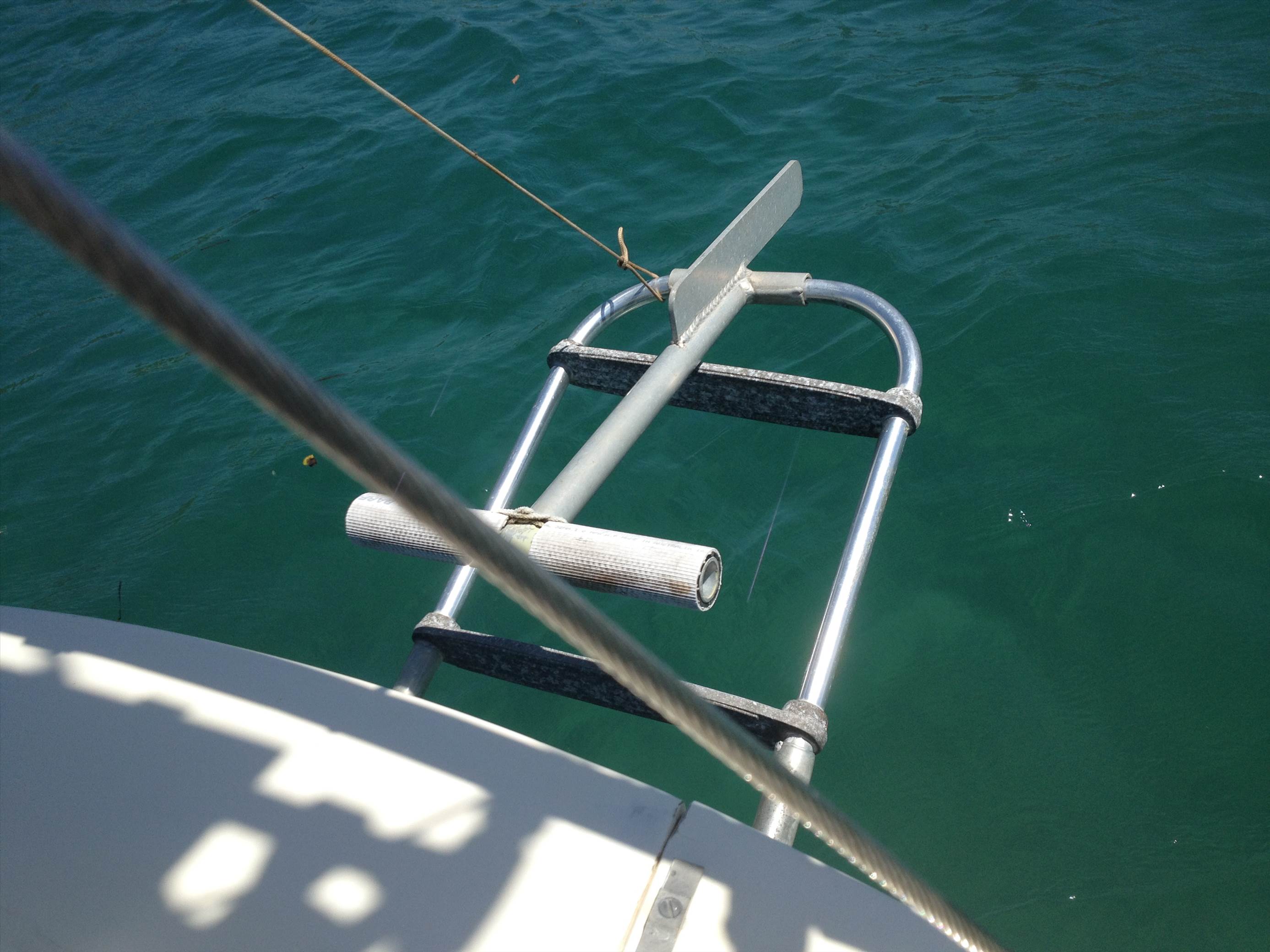 Don on our previous boat we had a folding stainless steel ladder and the bottom rung was just below the waterline. This was difficult to use when swimming so we used to attach a rope ladder to it. The problem was that it used to swing under the boat when climbing up onto the metal ladder. Not too bad if you are young and fit, but not good if you are older. I would imagine this would also be the case if you are cold, tired and in heavy wet clothes. The timber step idea may make it a bit easier to use, or perhaps the suggestion of a stainless steel extension could work?