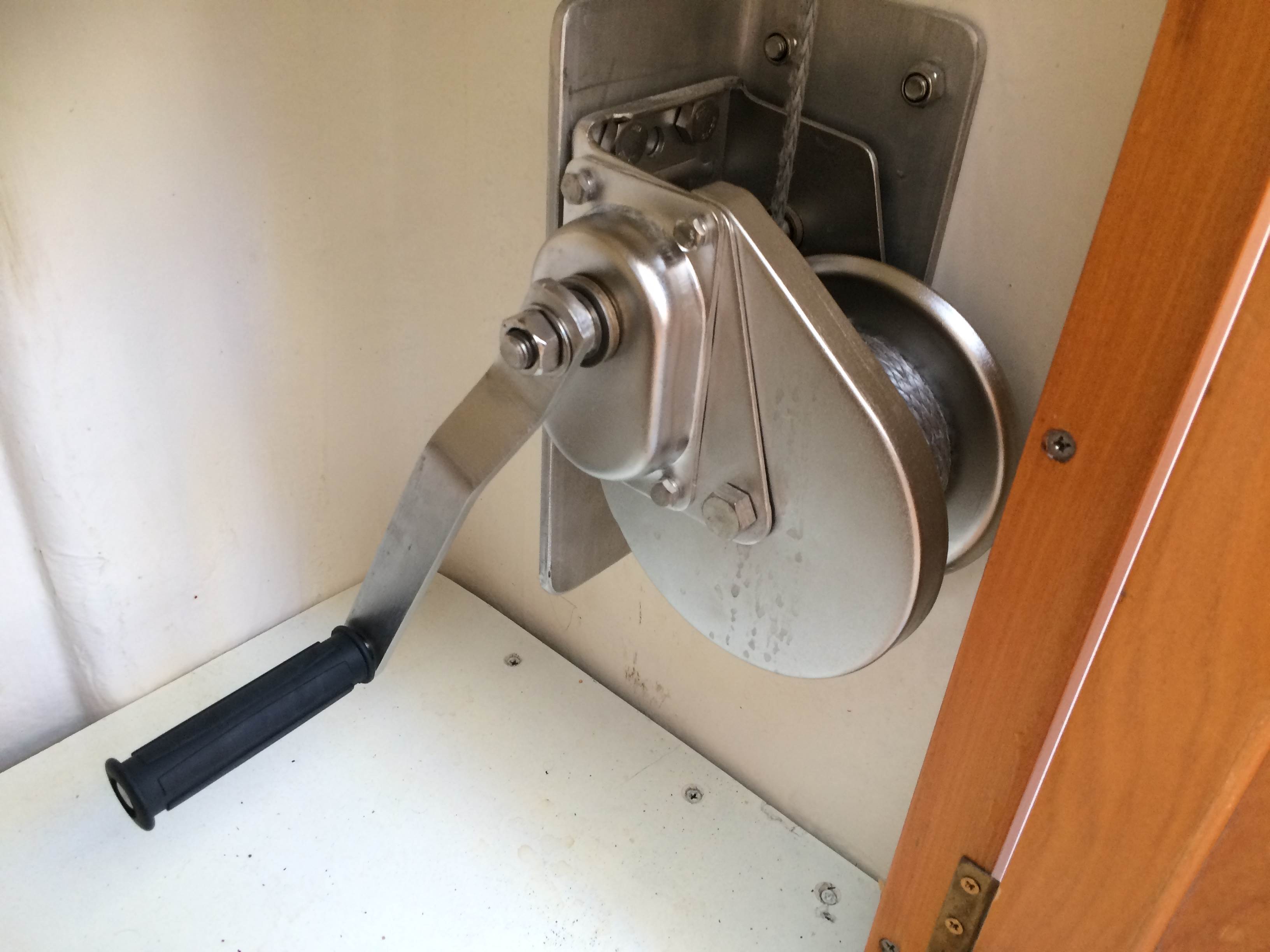 I would like to see the rest of the mechanism. Is it Dynema or wire on the winch? Perhaps more efficient tackle would compensate for the unusual access.