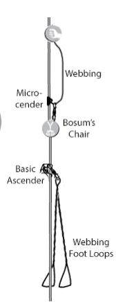 This arrangement requires two ascenders, a regular climbing ascender for the foot straps and a micocender for the bosun's chair. To ascend, sitting in the bosun's chair you grab the line above you as high as you can with one hand near but above the other. Then you stand up against the foot straps and hold onto the line.