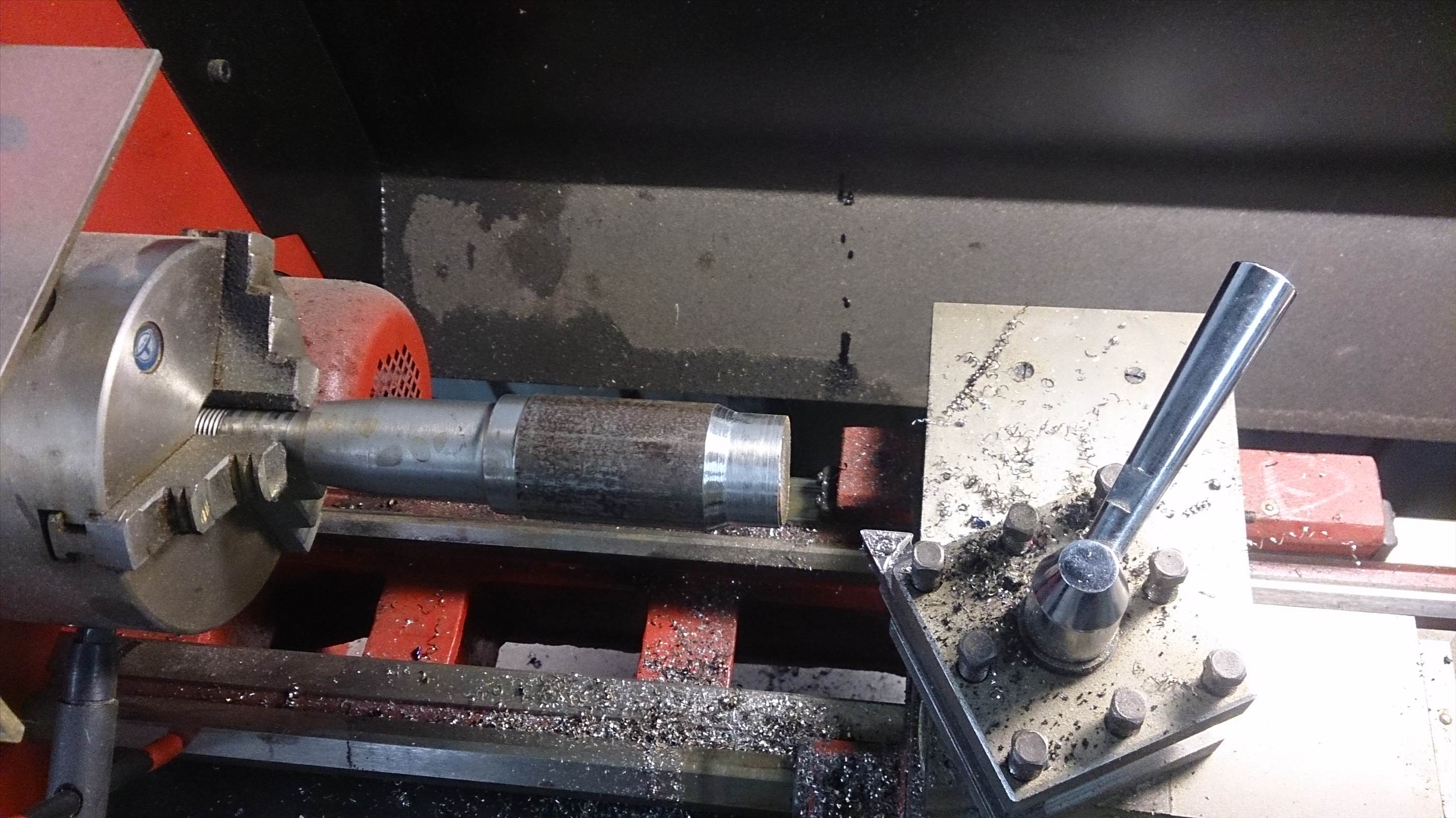 Lathing down the stub axles to fit inside the 40mm box section, the entire brown/rust section was lathed down to fit in.