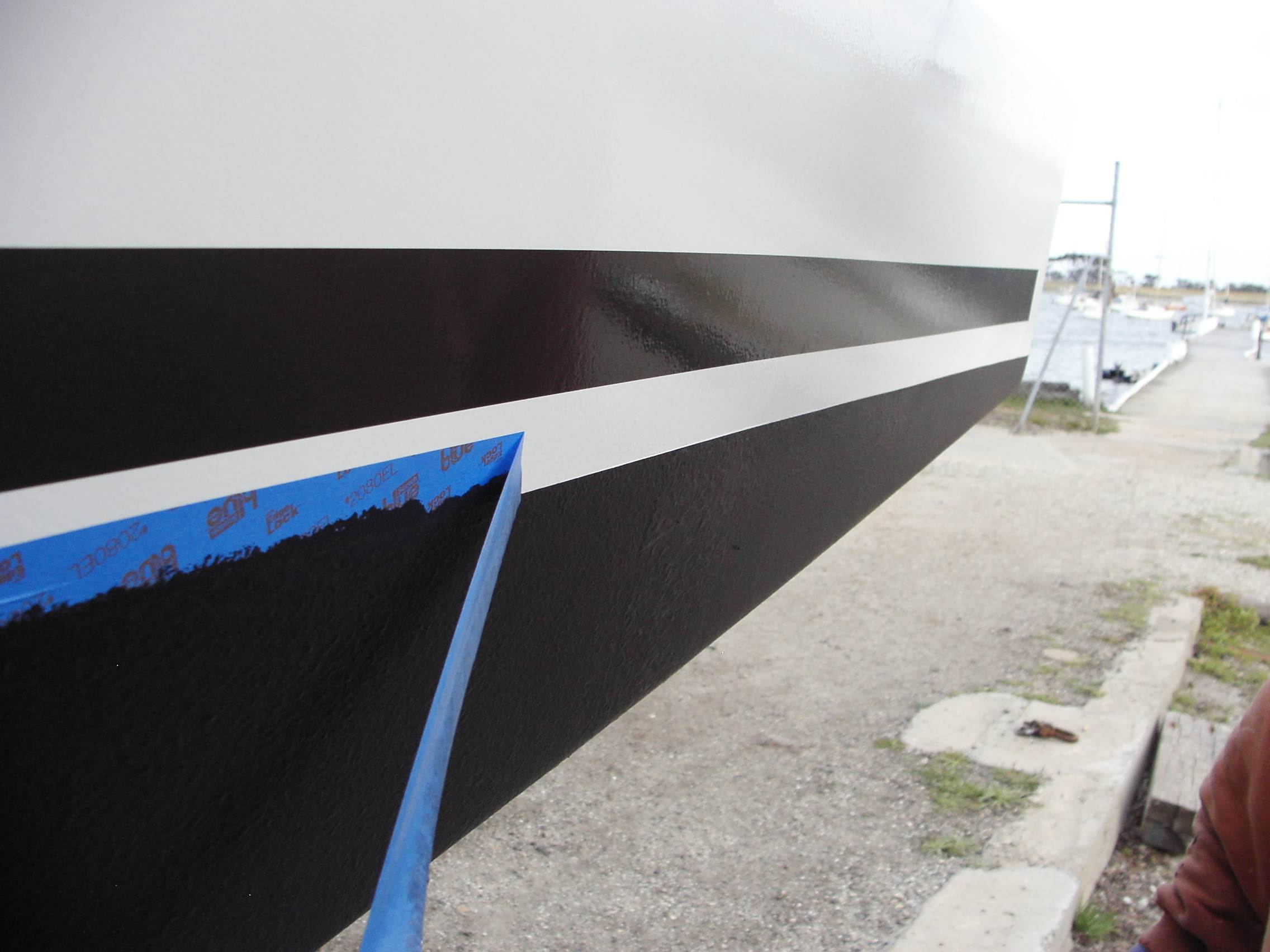 nah Stuman, do the strip yourself. This is 50mm metallic charcoal tape purchased online ebay. 2 years later its fine. Do like a 1'' tape down from your deckline as a guide, or above waterline if its going there, then place the tape next to it,press down hard and peel protective tape off. Below if the final waterline tape coming off but you get the idea. I needed a 50m roll to do both sides of 2 hulls for about $75, but you'd get away with 15m. Very rewarding part and finishes off IMHO.